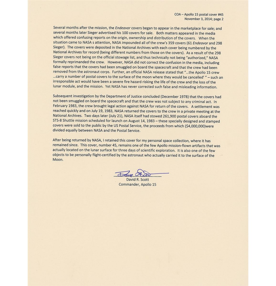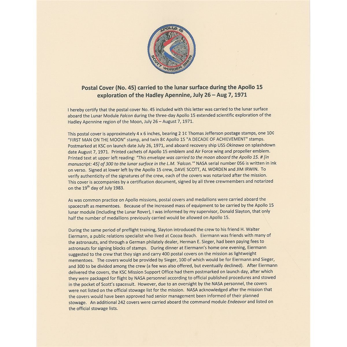 As was common practice on Apollo missions, postal covers and medallions were carried aboard the spacecraft as mementoes. Because of the increased mass of equipment to be carried by the Apollo 15 lunar module (including the Lunar Rover), the number of medallions was halved and 400 postal covers were carried instead. The covers were provided by a German stamp dealer, who would retain 100 (not to be sold on the open market), and 300 would be divided among the crew (a fee was also offered, but eventually declined). Several months after the mission, the German stamp dealer advertised his 100 covers for sale. When the situation came to NASA's attention, NASA impounded all of the crew’s covers, which were then deposited in the National Archives. In February 1983, the crew brought legal action against NASA for return of the covers. A settlement was reached quickly and on July 19, 1983, NASA returned the covers to the crew in a private meeting at the National Archives. During the settlement, the crew signed a notarized letter of provenance for each cover. The legal document is, of course, specific in its detail, noting that the postal covers “were carried aboard the Apollo 15 Mission…and carried aboard the Apollo 15 Spacecraft during the entire term of the Mission to include…the moon, and were returned to the Earth at the termination of the Mission on August 7, 1971.” The trail of the offered cover is a piece of space collectible legend, with provenance that tells the story in great detail.