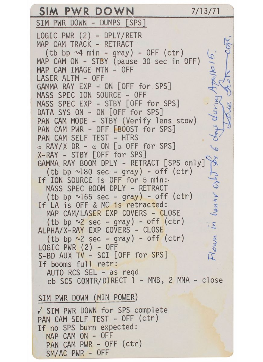 Flown single-sided cue card carried into lunar orbit during the Apollo 15 mission, 4 x 7, signed and flight-certified along the right border in blue ballpoint, “Flown into lunar orbit for 6 days during Apollo 15, Dave Scott CDR.” The card is headed “SIM Pwr Down” and provides procedures for shutting down the instruments in the SIM Bay, listing equipment such as “Map Cam,” “Laser Altm,” “Gamma Ray Exp,” “Pan Cam,” and “X-Ray.” A swatch of Velcro is affixed to the reverse so that it could be attached to various panels within the spacecraft. In very good condition, with stains to the lower half. Accompanied by an extremely detailed signed letter of provenance from Scott, in part: “I hereby certify that the ‘SIM PWR DOWN’ Cue Card included with this letter was flown aboard Apollo 15…The Cue Card lists a precise sequence of operations to power down (or turn off) the prime scientific instruments contained in the Service Module Scientific Instrument Module (SIM) Bay…This ‘SIM PWR DOWN’ Cue Card has been in my personal collection since returning to Earth.” His letter also provides comprehensive information about the functions of the different instruments listed on this card, with special attention paid to the X-Ray Spectrometer, which was used for both lunar surface operations and to investigate the potential existence of ‘Black Holes.’