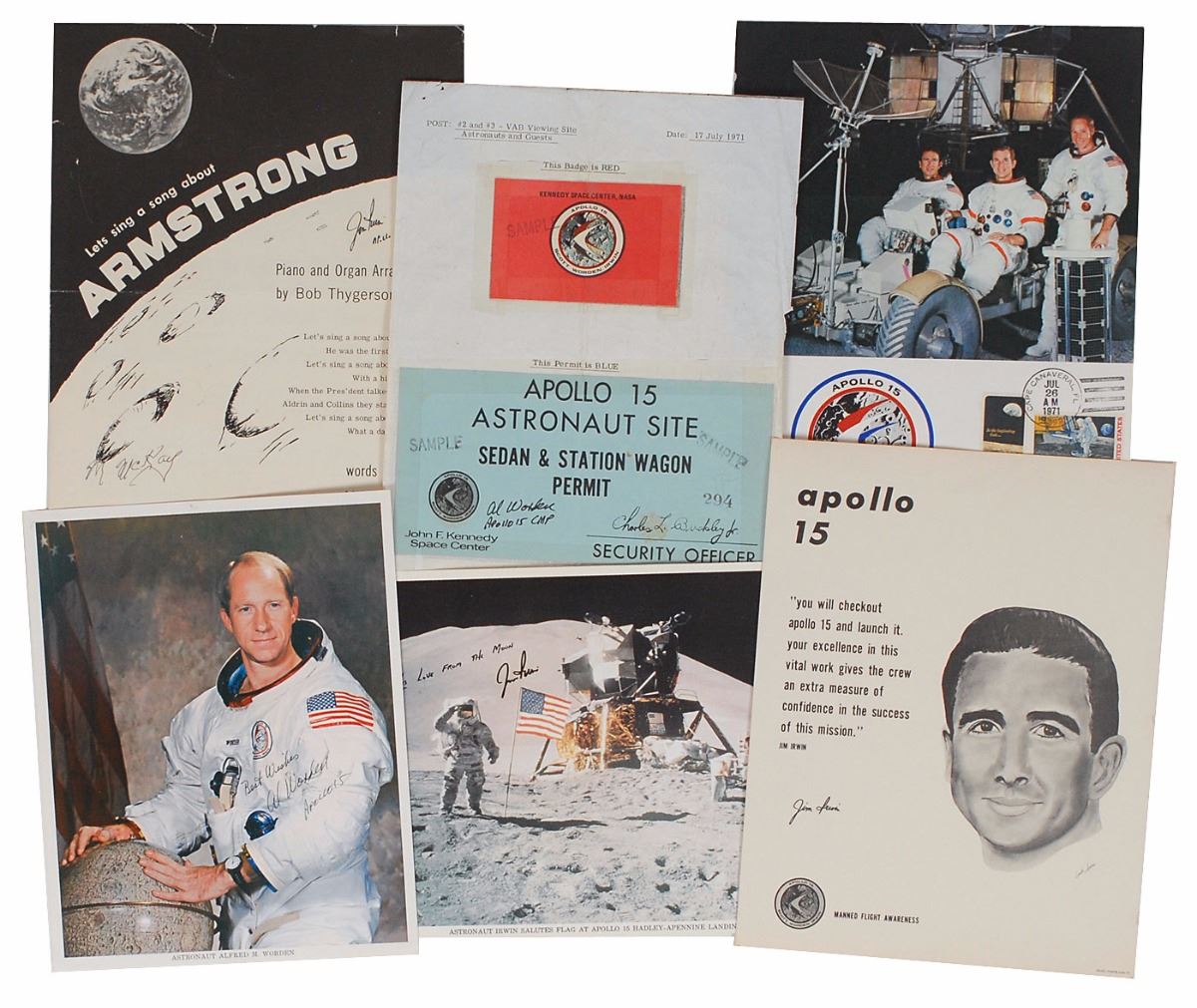 Four items: an official color 8 x 10 NASA lithograph of Worden posing in his white space suit, signed in black ink, “Best wishes, Al Worden, Apollo 15”; a color 10 x 8 NASA lithograph of Jim Irwin saluting the American flag during his mission, signed in black felt tip beneath a pre-printed sentiment; sheet music for ‘Let’s Sing a Song About Armstrong,” 8.75 x 11.5, four pages on two adjoining sheets, signed on the front cover in black felt tip, “Jim Irwin, Apollo 15,” adding a small crescent moon, and by the songwriter Marion McKay; and an off-white 8.5 x 11 “VAB Viewing Site” sheet for astronauts and guests, dated July 17, 1971, affixed with a red Kennedy Space Center badge, and a blue Apollo 15 Astronaut Site “Sedan & Station Wagon Permit,” the latter is signed in black felt tip, “Al Worden, Apollo 15 CMP.” A central vertical fold to the Worden lithograph, trivial haloing to the Irwin photo, some small edge tears and haloing to the signature on the music sheet, and scattered creasing, soiling, and some edge tears to the VAB sheet, otherwise overall fine condition. Accompanied by an unsigned RCA promo sheet for the Apollo 15 mission, postmarked July 26, 1971, and a Manned Flight Awareness sheet bearing a quote and image of Irwin, with his pre-printed signature below.