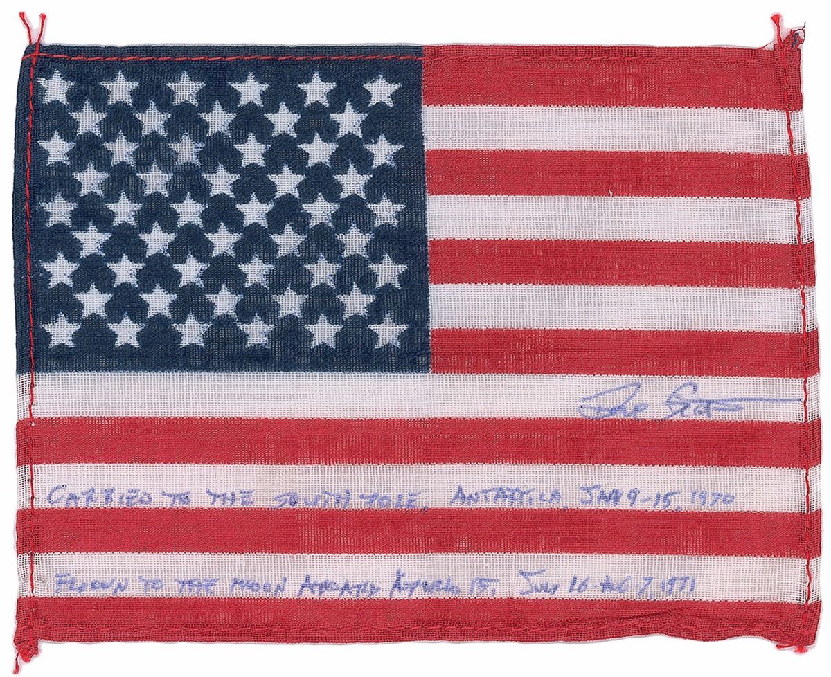 Flown American flag, 5.5 x 4, carried to the South Pole in 1970, and flown to lunar orbit during the Apollo 15 mission. Flag is signed on three white stripes in blue ink, “Dave Scott, carried to South Pole, Antarctica, Jan 9–15, 1970. Flown to the moon aboard Apollo 15, July 26–Aug 7, 1971.” Accompanied by a letter of authenticity from Dave Scott stating, in part, “I hereby certify that the United States flag included with this letter…is from my personal collection and was carried to the South Pole, Antarctica…and then flown in lunar orbit for six days aboard the CSM Endeavour during Apollo 15…I was a member of the NASA contingent of six on an official visit to Antarctica from 9 through 15 January 1970…Throughout the journey, I carried the attached United States flag in the pocket of my parka as a symbol of exploration…This South Pole/Apollo 15 US flag has been in my personal collection since returning to Earth.” In fine condition. Flags carried on any Apollo mission are highly desirable, with this particular flag making an extra trip to the bottom of the world.