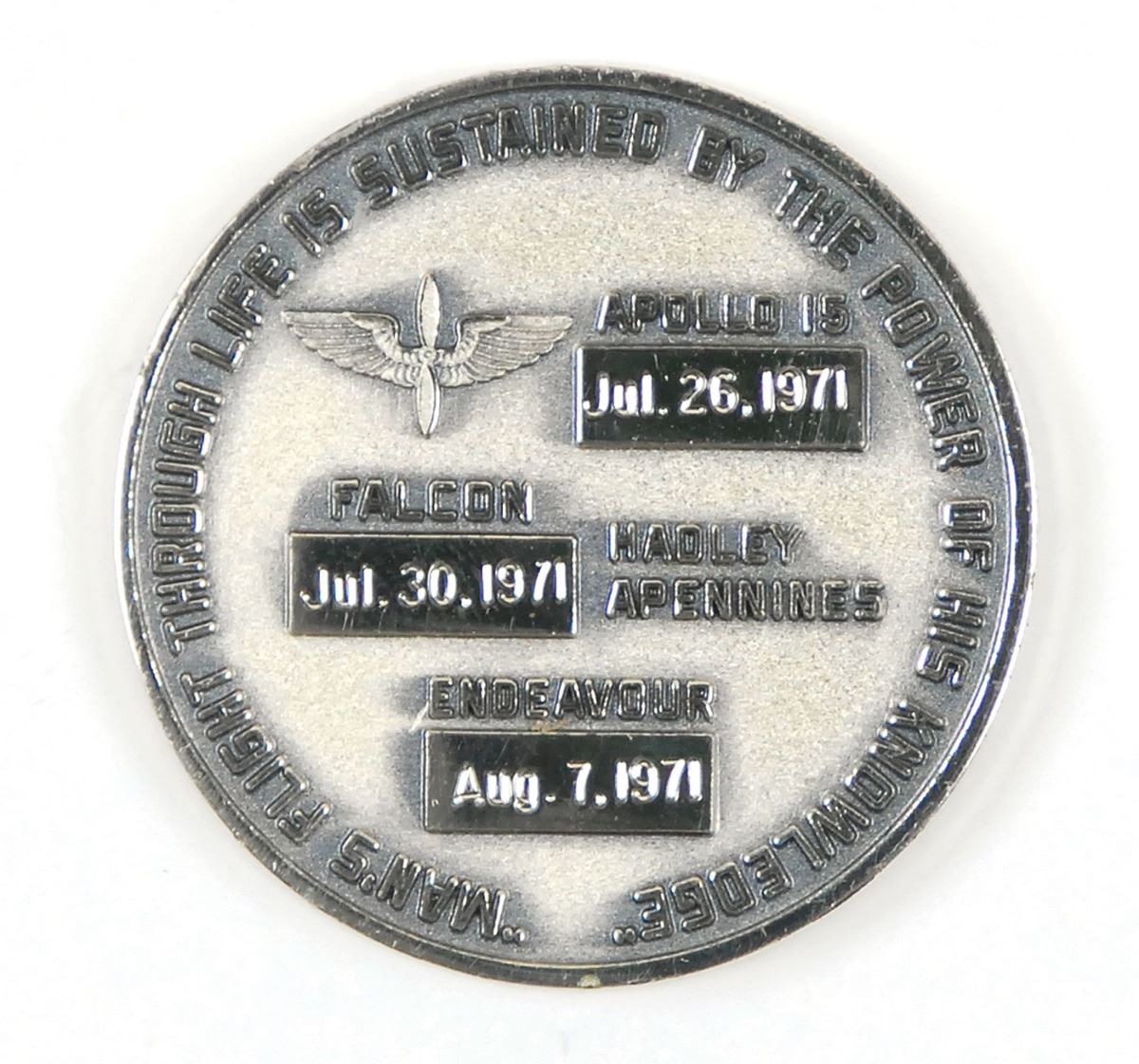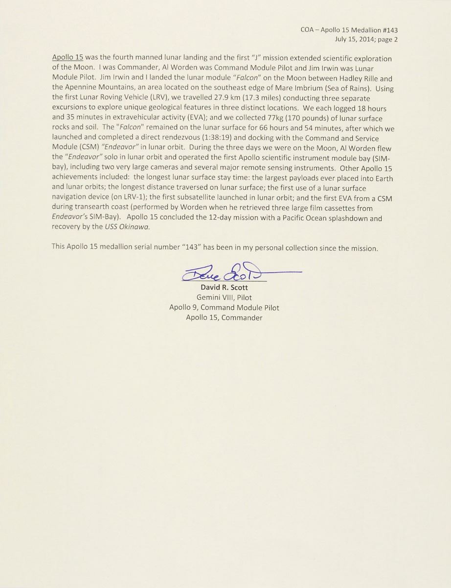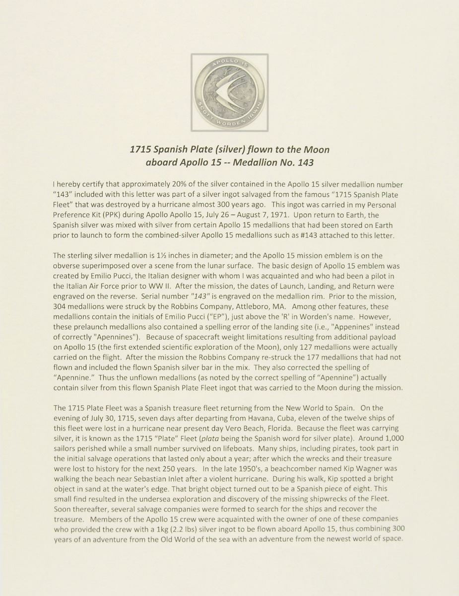 Apollo 15 Robbins Medal, approximately 1.5? diameter, with a raised design on the face of the Apollo 15 mission insignia. The reverse of the sterling silver medal is engraved “Man’s Flight Through Life Is Sustained by the Power of His Knowledge” along with the July 26, 1971, launch date; July 30, 1971, moon landing date; and August 7, 1971, return date. This medal is serial numbered “143” along the rim and was not flown. Medal comes in its original case, also numbered “143.” Condition is mint state. Accompanied by a letter of authenticity from Dave Scott stating, in part: “I hereby certify that approximately 20% of the silver contained in the Apollo 15 silver medallion number ‘143’ included with this letter was part of a [1 kg] silver ingot salvaged from the famous ‘1715 Spanish Plate Fleet’ that was destroyed by a hurricane almost 300 years ago. This ingot was carried in my Personal Preference Kit (PPK) during Apollo 15, July 26-August 7, 1971. Upon return to Earth, the Spanish silver was mixed with silver from certain Apollo 15 medallions that had been stored on Earth prior to launch to form the combined-silver Apollo 15 medallions such as #143…Prior to the mission, 304 medallions were struck [but due to weight limitations only 127 were carried on the flight]…After the mission the Robbins Company restruck the 177 medallions that had not flown and included the flown Spanish silver bar in the mix…This Apollo 15 medallion serial number ‘143’ has been in my personal collection since the mission.” Prior to Apollo 15, the entire run of medallions had been carried on each flight; but because of spacecraft weight limitations resulting from additional payload on Apollo 15 (the first extended scientific exploration of the Moon), this mission could only carry 127 on board. Though unflown in their final format, these post-mission medallions (as noted by the correct spelling of ‘Apennine’) do contain flown silver from the Spanish Plate Fleet ingot—which clocked twice as much lunar flight time as any complete medallions carried on any flight before Apollo 15—combining 300 years of adventure, from Old World sea exploration to the modern world of space exploration.