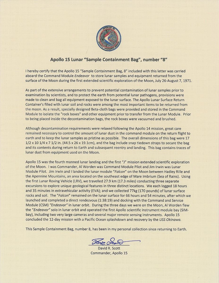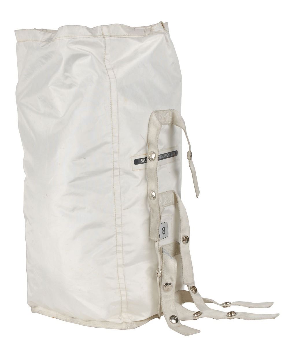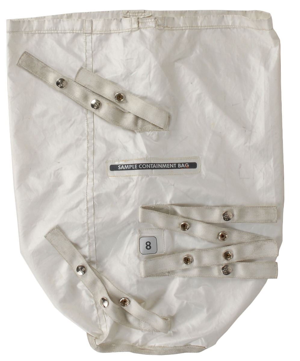 Large flown sample containment bag carried on board Apollo 15, measuring 17.5 x 10.25 x 7.5, annotated in black felt tip, “LM Return Items For Crew.” The off-white beta bag is labeled on its front, “Sample Containment Bag,” and just below, “8,” and features a set of four snap tie-down straps to secure the bag and its contents during the subsequent reentry and landing on Earth; the bag contains traces of lunar dust from equipment used on the moon’s surface. The bottom of the bag bears faint ID numbering, “LOW340–60791–1, 0006.” In fine condition, with expected wear from use. Accompanied by a signed letter of authenticity from Apollo 15 Commander Dave Scott, in part: “I hereby certify that the Apollo 15 ‘Sample Containment Bag, 8’ included with this letter was carried aboard the Lunar Module ‘Falcon’ to store lunar samples and equipment returned from the surface of the Moon during the first extended scientific exploration of the Moon…As part of the extensive arrangements to prevent potential contamination of lunar samples prior to examination by scientists, and to protect the earth from potential lunar pathogens, provisions were made to clean and bag all equipment exposed to the lunar surface. The Apollo lunar surface Sample Containment Bags (SCBS) were filled with lunar soil and rock samples as well as surface equipment such as film magazines and cameras—such samples and photos were the primary objectives of Apollo missions. Great care was necessary to keep the lunar samples as pristine as possible as well as to control the amount of lunar dust in the spacecraft. As a result, specially designed polyester Beta-cloth bags were provided to package groups of samples for transfer from the LM Falcon to the Command Module (CM) Endeavor after rendezvous in lunar orbit. The bag included snap tie-down straps to secure the bag and its contents during return to Earth and subsequent reentry and landing. This SCB number 8 was stored in the LM Modular Equipment Stowage Assembly (MESA) for Earth launch and landing on the Moon. It was retrieved from the MESA during EVA-3 to package individual samples collected during the final exploration of Hadley Rille as well as samples collected in the vicinity of the LM prior to final closeout before launch. This bag contains traces of lunar dust from sample collection bags and equipment returned from the Moon...This Sample Containment Bag, number 8, has been in my personal collection since returning to Earth.” The continued technological advancement of the Apollo program enabled its fifteenth mission to achieve a myriad of scientific firsts—the debut of the lunar rover, the affirmation of Galileo’s gravitational theory, and the collection of 170 pounds of lunar material, portions of which were stored and transported within this very bag. Augmented by its rock-solid provenance, this sample containment bag exists as a remarkable, lunar-flown piece of Apollo history.