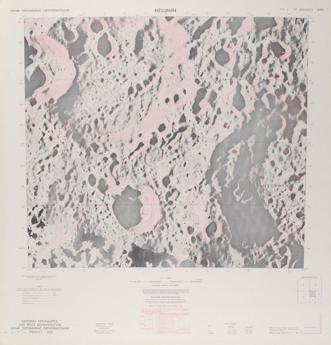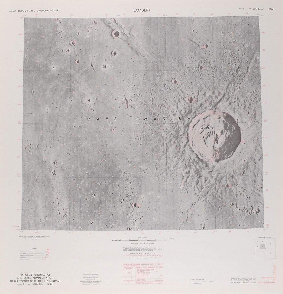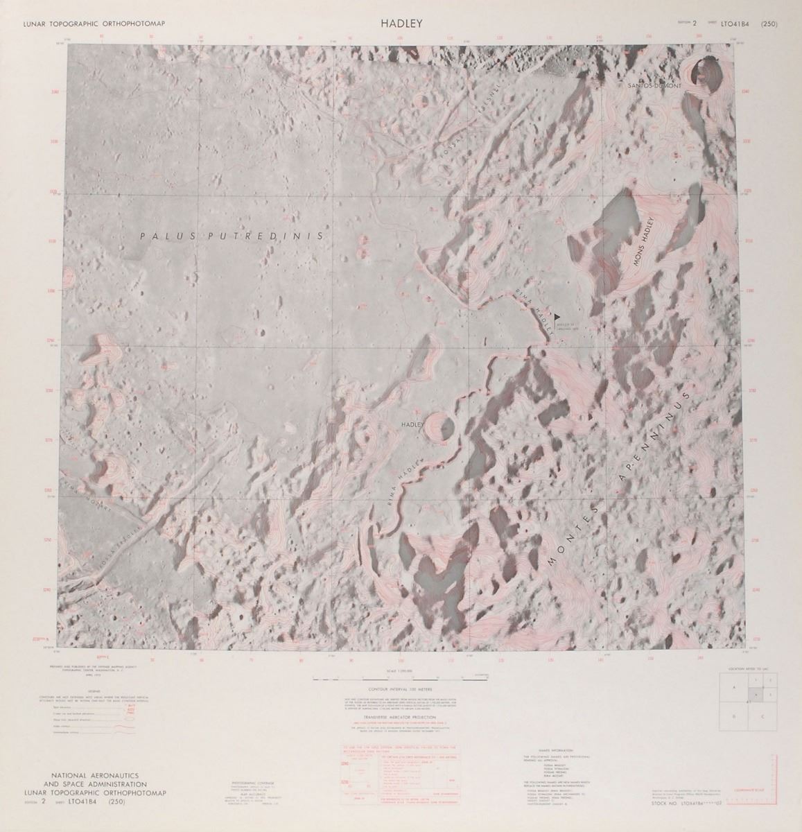 Collection of four original charts from the Lunar Topographic Orthophotomap Series, including one of the Apollo 15 landing area. All four measure 25.5? x 26.5? and are 1:250,000 in scale. Charts are titled “Hadley,” “Smithson,” “Lambert,” and “Neujmin.” Rolled and in fine condition, with scattered edge creases.