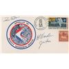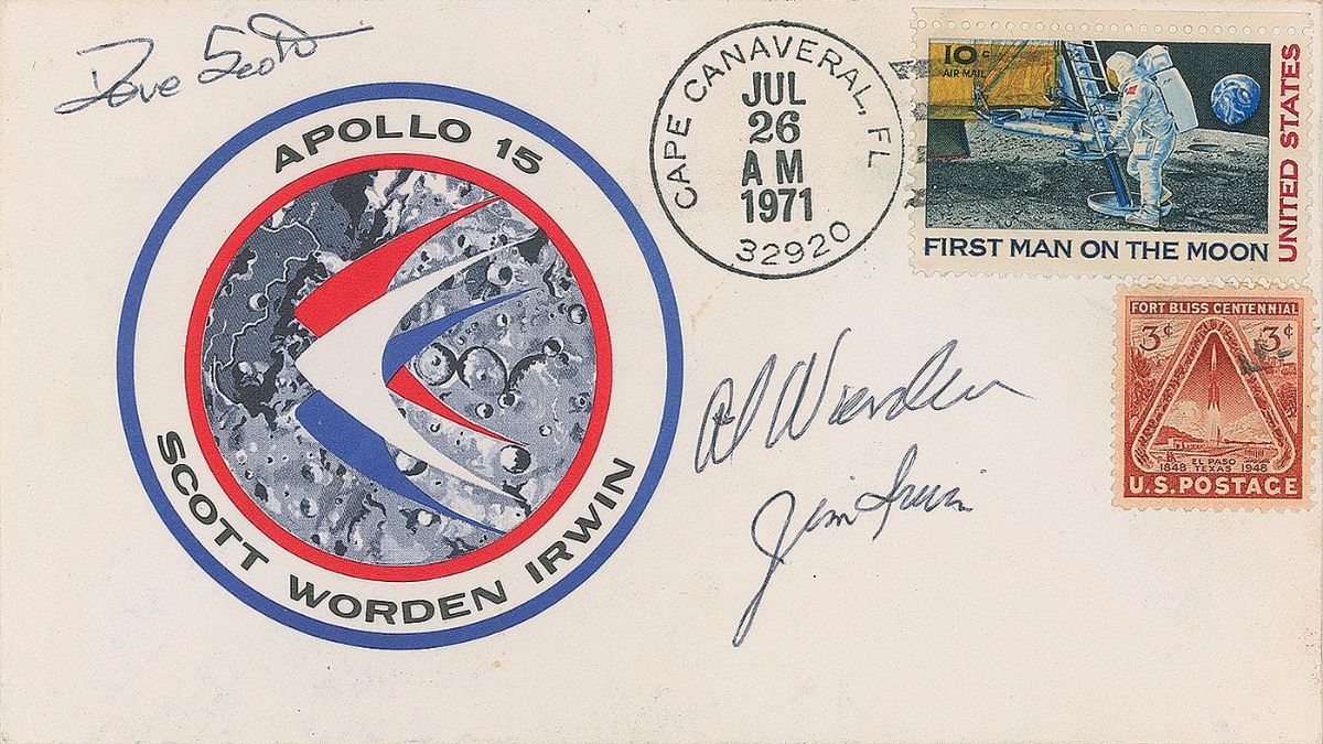 Commemorative cover with a cachet of the Apollo 15 mission insignia, postmarked July 26, 1971, Cape Canaveral, FL, signed in black ballpoint by Dave Scott, Al Worden, and Jim Irwin. In fine condition.