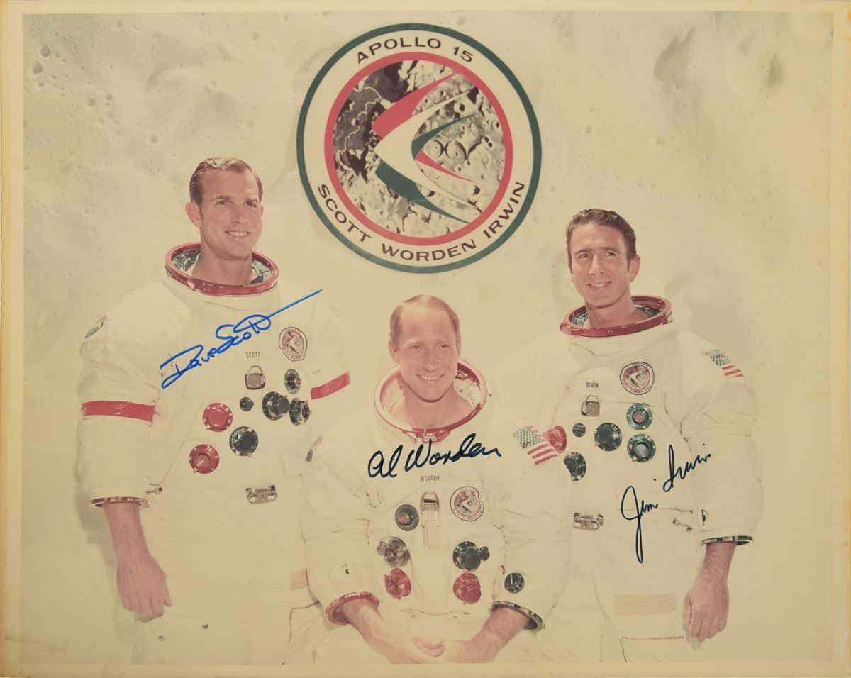 Official color glossy 10 x 8 NASA photo of the Apollo 15 crew in their white space suits, signed in felt tip by Dave Scott, Al Worden, and Jim Irwin. Reverse bears purple NASA caption text and “A Kodak Paper” watermarks. In very good to fine condition, with overall irregularity to the emulsion, visible only at an angle. From the personal collection of Al Worden and accompanied by a letter of authenticity signed by him, in part: "I certify that this photograph of the crew of Apollo 15 is from my personal collection. It has been in my possession since July 1971 and I confirm that the signatures are authentic."