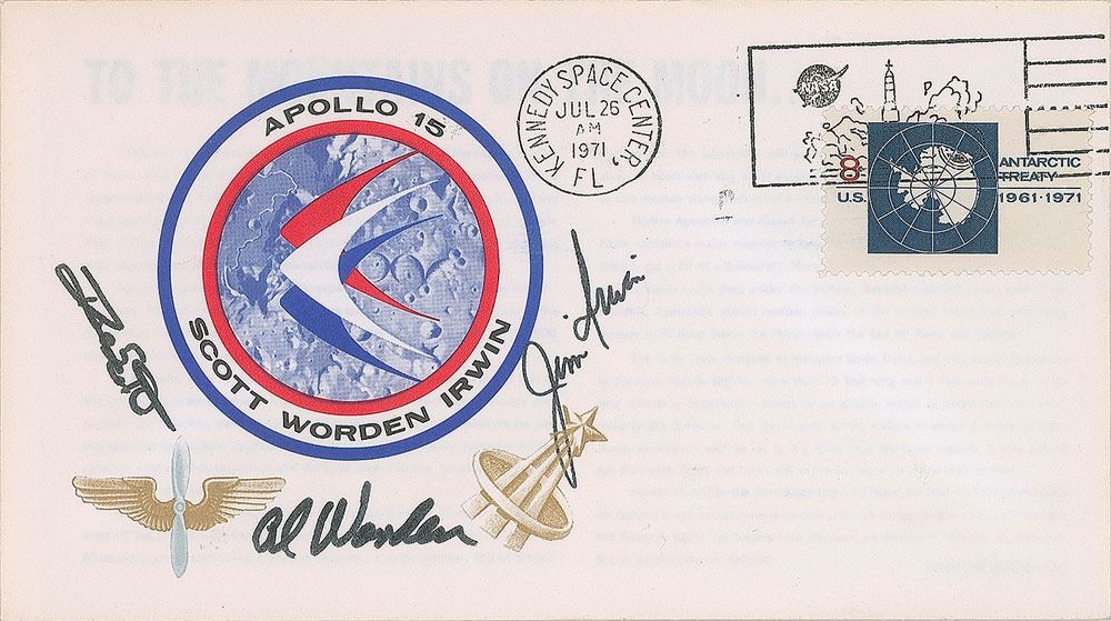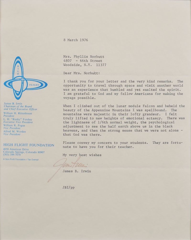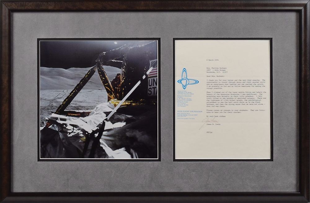 Two items: a launch day ‘Bishop’ commemorative cover with a cachet honoring Apollo 15, postmarked July 26, 1971, at the Kennedy Space Center, signed in black felt tip, "Dave Scott," "Al Worden," and "Jim Irwin"; and a TLS, signed "Jim Irwin," one page, 7.75 x 9.75, March 8, 1976, High Flight letterhead, addressed to school teacher Phyllis Norbutt, in part, “The opportunity to travel through space and visit another world was an experience that humbled and yet exalted the spirit. I am grateful to God and my fellow Americans for making the voyage possible. When I climbed out of the lunar module Falcon and beheld the beauty of the Apennine Mountains I was spellbound. The mountains were majestic in their lofty grandeur. I felt truly lifted to new heights of emotional ecstasy. There was the lightness of the 1/6th normal weight, the psychological adjustment to see the half earth above us in black heavens, and then the strong sense that we were not alone—that God was there.” The letter is double-matted and framed with a color photo of Falcon on the lunar surface to an overall size of 26 x 17. In overall fine condition, with slight fading to signature on the letter.