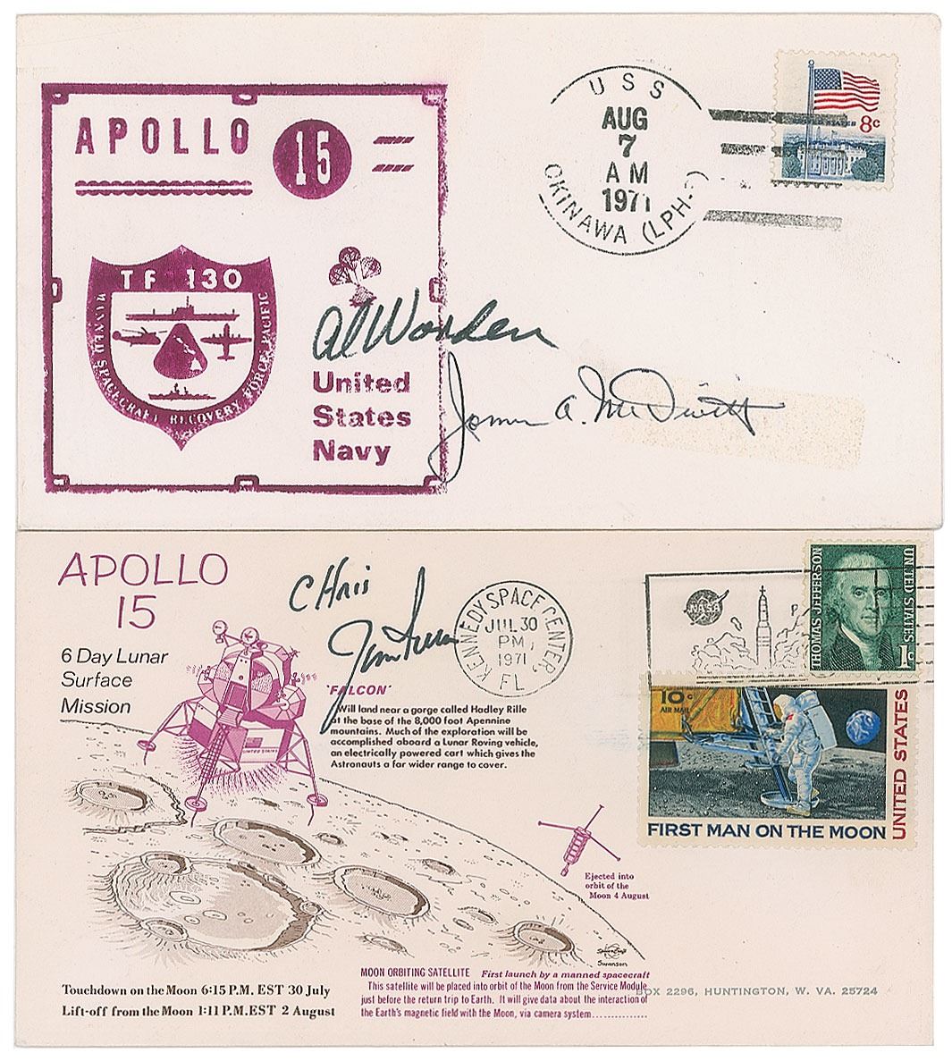 Two covers: a lunar landing day cover with a cachet honoring Apollo 15, postmarked at Kennedy Space Center on July 30, 1971, signed and inscribed in black felt tip, "Chris, Jim Irwin"; and a recovery cover with a cachet honoring the Apollo 15 US Navy Recovery Force, postmarked on the USS Okinawa on August 7, 1971, signed in black felt tip by Al Worden and Jim Irwin. In very fine condition.