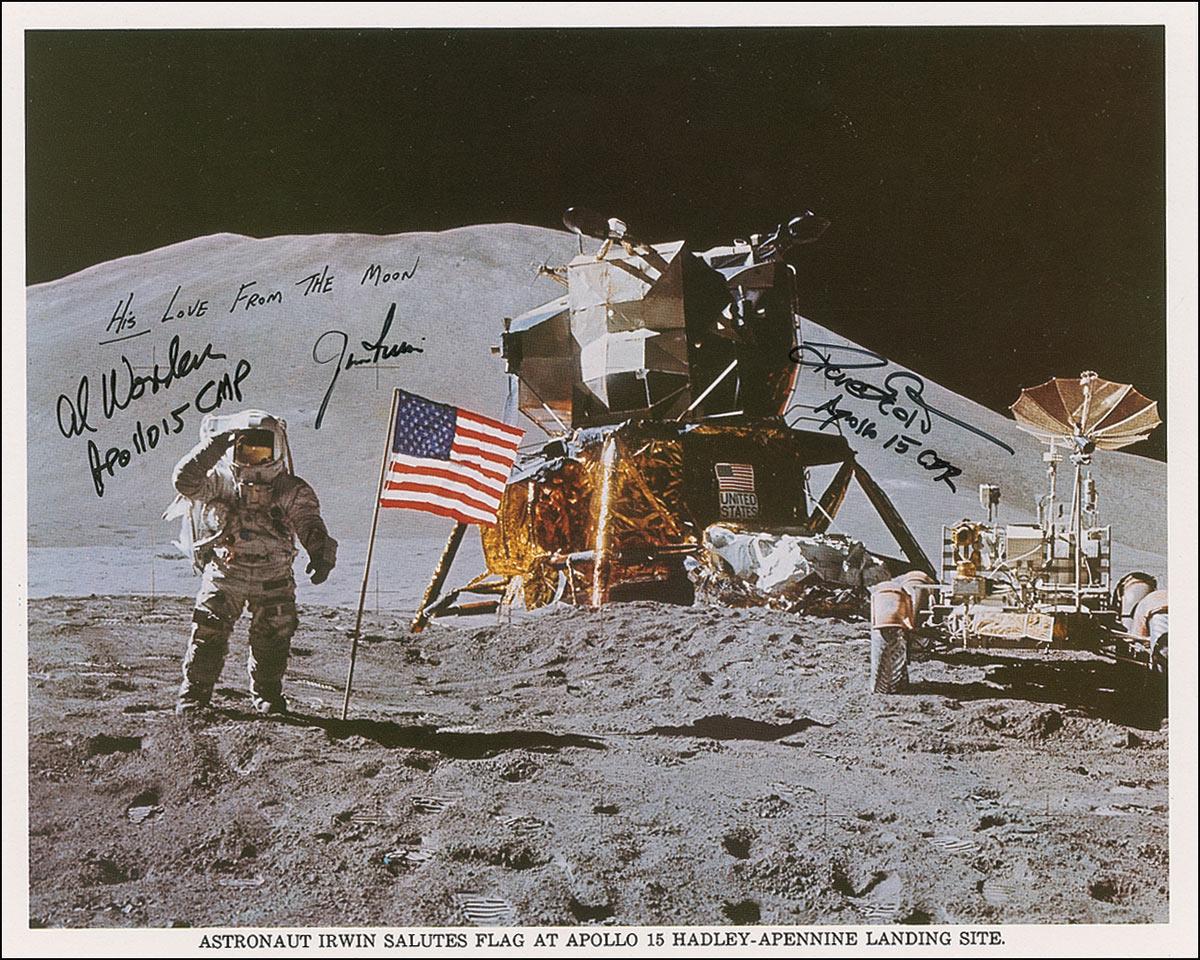 Color 10 x 8 NASA photo of astronaut James Irwin saluting the flag while on the lunar surface, signed in black felt tip, “Jim Irwin,” beneath a pre-printed sentiment, “Dave Scott Apollo 15 CDR,” and “Al Worden, Apollo 15 CMP.” In very fine condition.