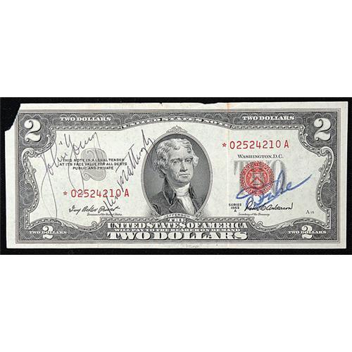 <Our item number 138348><B>Apollo 16, 1972, Crew-signed $2 Bill.</B> This 1953 circulated $2 bill is boldly crew-signed by John Young, Ken Mattingly and Charie Duke. The upper left corner of the bill was torn off by the crew to "drain" the unlucky demons from it prior to the flight. Who says that superstitions don't walk among us still. Even if the crew didn't believe in them, why take the chance. A great piece of memorabilia that doesn't come along every day. <BR>Estimated Value $350 - 500. <BR><BR>Our item number 138348<BR><IMAGES><P ALIGN="CENTER"><IMG SRC="http://www.goldbergcoins.net/liveauction/49jpegs/138348.jpg"> </P></IMAGES>