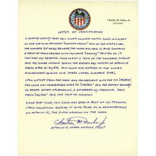 <B>Apollo 16 Lunar and Command Module Flown Metal Comb used by Charles Duke.</B></I> The comb, with the name "Charley" written on a piece of hook Velcro, is 5.125". It remained on the surface of the moon for almost 72 hours and was exposed to the vacuum of space on each of the three EVAs. The comb was transferred to the Command Module <I>Casper</B></I> with the crew and was returned to Earth. <I>From the collection of Charles M. Duke, Jr., who has included a handwritten and signed Letter of Certification verifying its provenance</B></I>.<BR><BR><b>Shipping:</b> Flat Material, Small (<a target="_blank" href="http://www.heritageauctions.com/common/shipping.php">view shipping information</a>)
