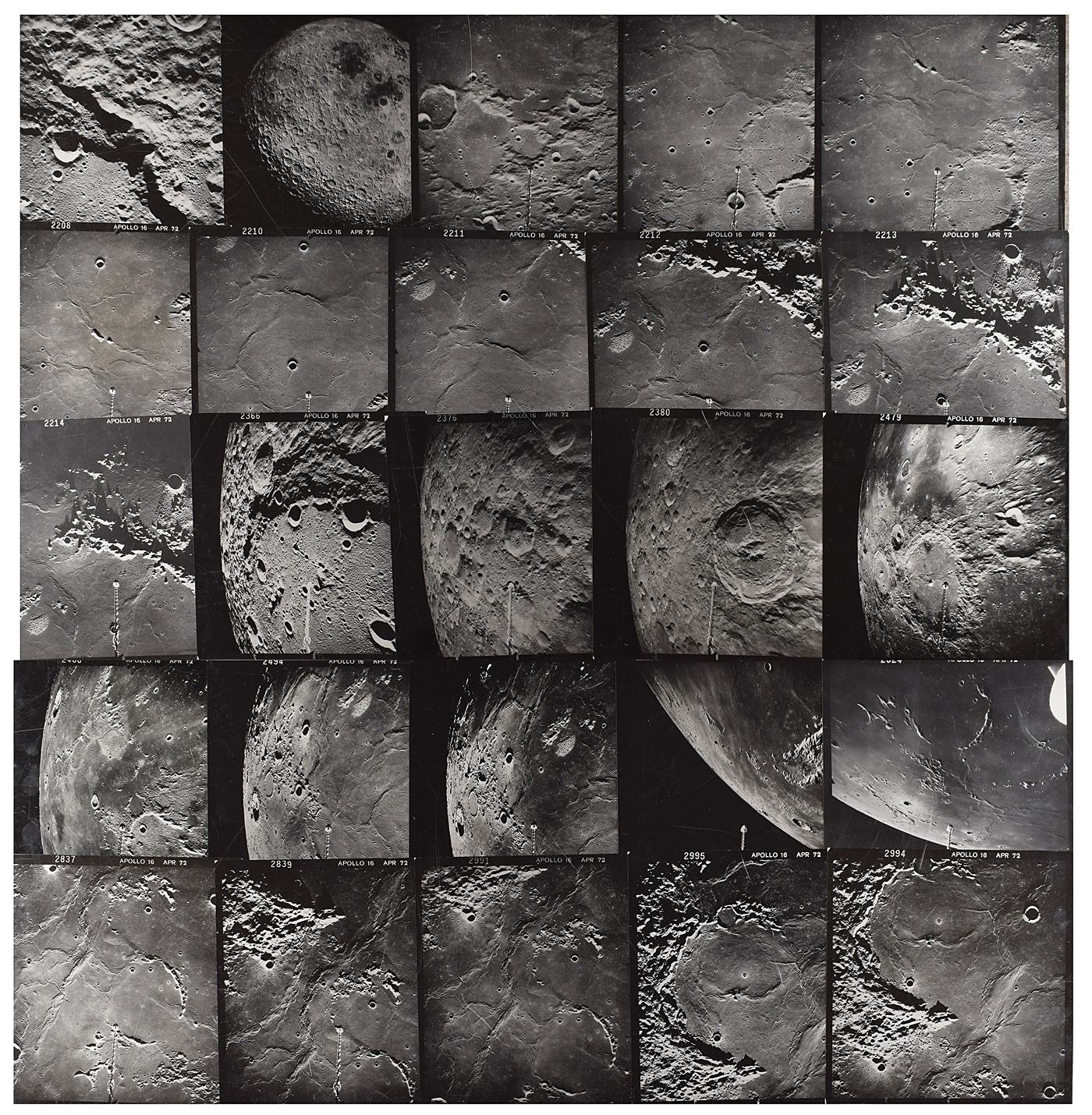 Collection of 25 vintage second-generation glossy 10 x 10 silver gelatin photographs taken by the Metric Mapping Camera during Apollo 16, featuring a number of matched pairs and consecutive sequences taken across the lunar surface. Includes an important image of the full lunar disk taken as the astronauts returned to Earth (considered a 'mystery' because the MMC was only supposed to operate while in lunar orbit), as well as imagery of Montes Riphaeus, Rimae Herigonius, and the craters 'Mendeleev,' 'Hartmann,' 'Davy,' 'Bonpland,' 'Parry,' 'Euclides,' 'Gregory,' 'Morozov,' 'King,' 'Ptolemaeus,' 'Guericke,' 'Letronne,' and others. Also includes sunrise/sunset terminator sequences and stereo pairs. Each frame is identified in the border with its four-digit number and "Apollo 16, Apr 72." In overall fine condition. Consignor notes that these photographs were acquired while working at the Manned Spacecraft Center from 1972–1974. These images were used by Planetary Scientists to not only help identify future landing sites, but also to understand the formation and evolution of the Moon.