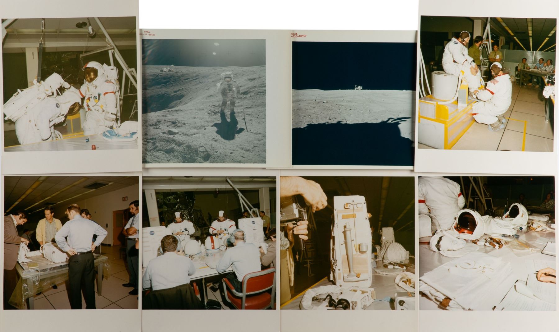 Group of eight original vintage glossy NASA photos, 8 x 10 and 10 x 8, six of which show Apollo 16 Extravehicular Mobility Unit (EMU) exercises at the Flight Crew Training Building, and the other two photos, both red-numbered, depict Apollo 16 activities on the lunar surface. The red-numbered photos include an image of LMP Charlie Duke obtaining rock samples near the moon's Plum Crater and the other image shows the lunar rover, centered and off in the distance, driving on the lunar horizon. The training photos, four of which depict Duke and CDR John Young, offer behind-the-scene glimpses of EMU fitting and checking. Reverse of each photo bears “A Kodak Paper” watermarks, with six featuring purple NASA caption text. In overall fine condition.