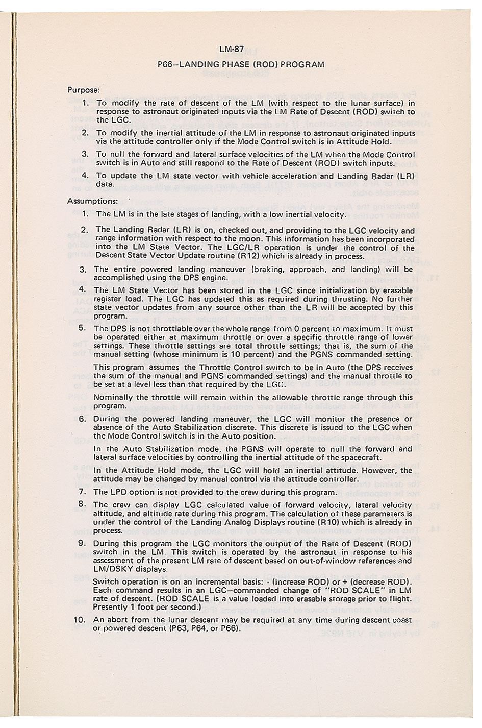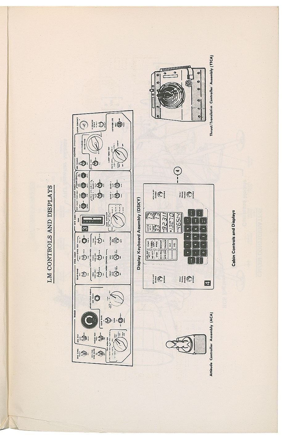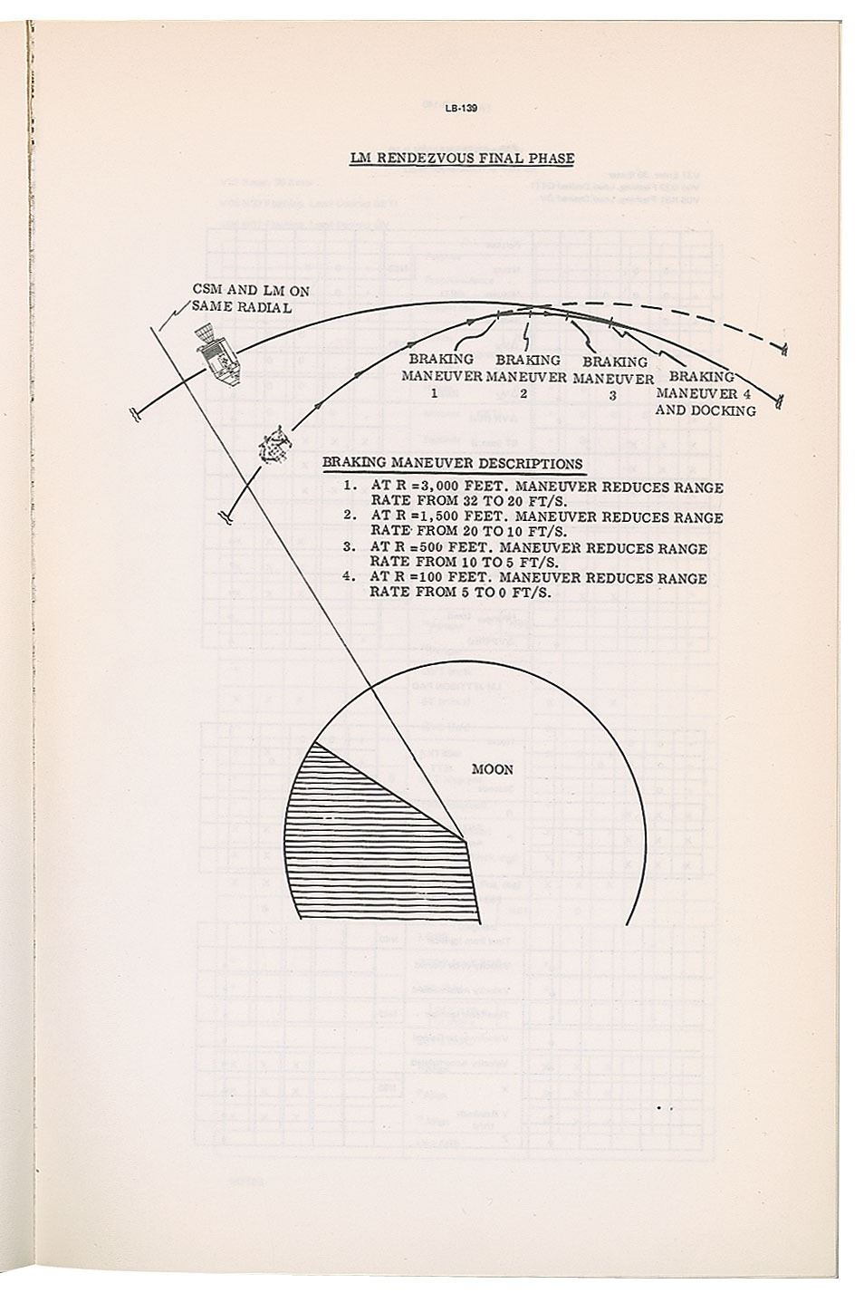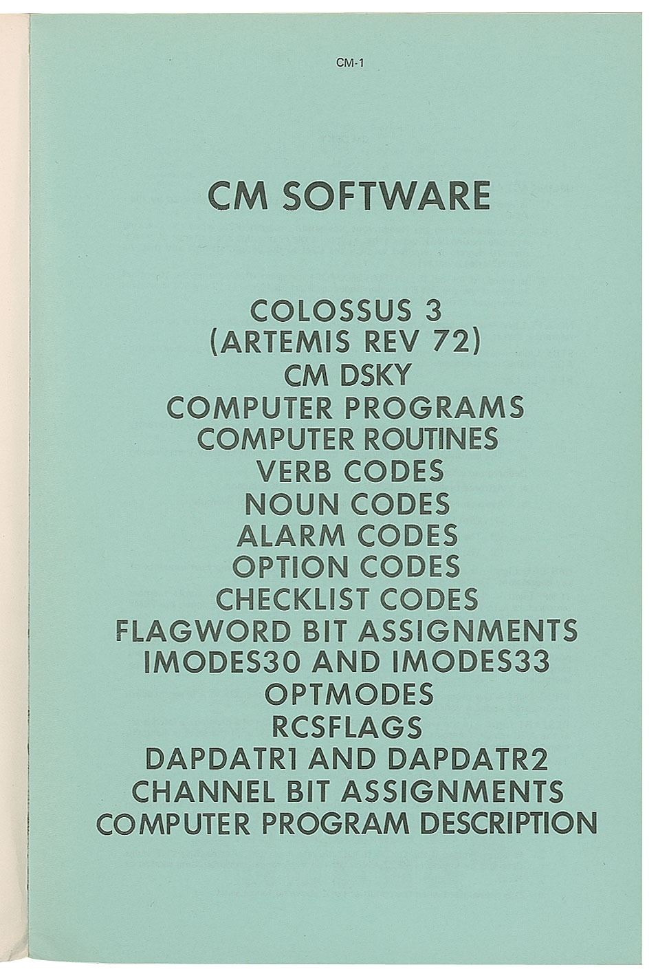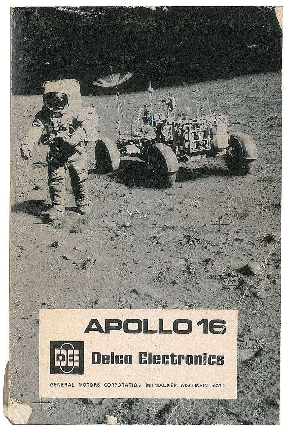 Apollo 16 "Guidance and Navigation Summary" manual by Delco Electronics, 547 pages, 5.5 x 8.5, containing sections on "CM Software," "LM Software," "ASPO 45 CRT Displays," "Launch and Burn Schedule," "Burn Perturbations," "Science," and "Hardware." The manual contains numerous diagrams, instructions, lists, and code definitions related to the guidance and navigation systems used on the Apollo 16 lunar landing mission. In very good condition, with overall wear, creasing to the covers and spine from use, and a tear at the bottom of the spine.