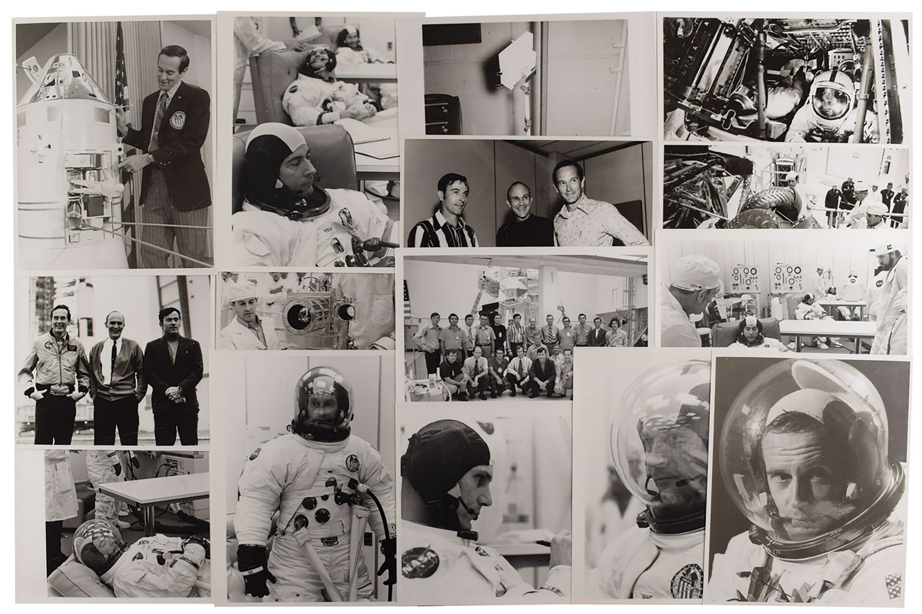 Group lot of 15 vintage original NASA photographs documenting preflight events of the Apollo 16 mission, each glossy finished, 8 x 10 and 10 x 8, with the majority bearing purple NASA caption text on reverse. Images include: the prime crew of Charlie Duke, Ken Mattingly, and John Young posing in front of their Saturn V rocket; Duke standing and delivering a speech next to a large model of the Command Module Casper; Young closely examining a Far Ultraviolet Camera; a Microbial Ecology Evaluation Device installed in the Command Module; Mattingly during an extravehicular activity training session; the crew posing next to a lunar globe; Duke inspecting the stowed and folded lunar rover; and several images of the crew in their white space suits prior to launch. In overall fine condition, with trivial wear to edges.