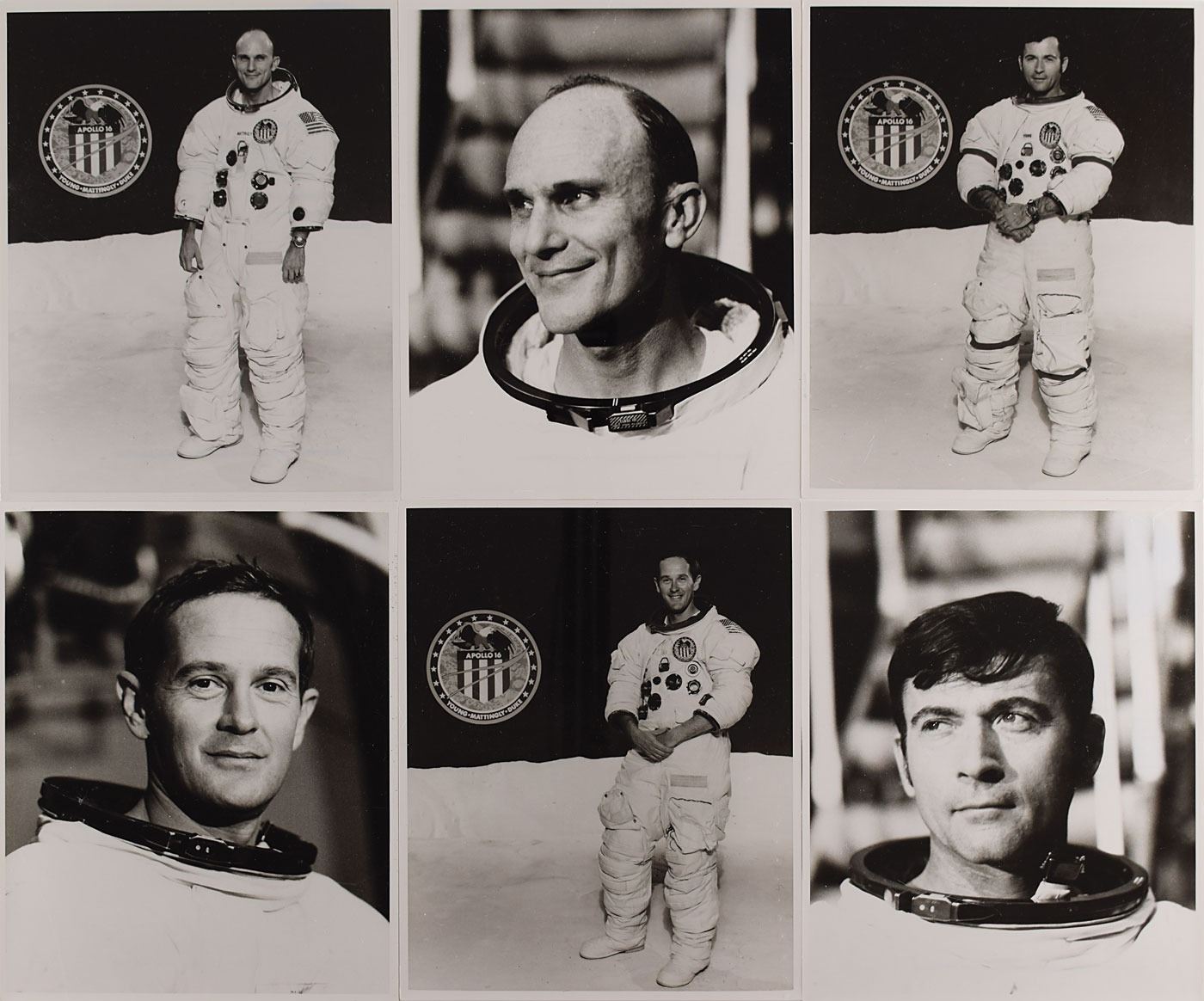 Appealing group lot of six vintage original glossy 8 x 10 NASA photographs of Apollo 16 crew members Charlie Duke, John Young, and Ken Mattingly, consisting of three official close-up portraits and three official full-length space suit portraits with the Apollo 16 emblem in the background. Reverse of each bearing purple NASA caption text. In overall fine condition.