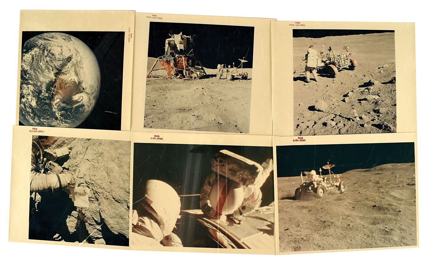 Appealing group lot of six official color glossy 10 x 8 red-numbered NASA photos from the Apollo 16 mission, with images including: a view of Earth taken from space on April 16, 1972; the Lunar Module Orion at the Descartes landing site, with John Young pictured standing behind the Lunar Rover; CMP Ken Mattingly performing an EVA during trans-earth coast; Charlie Duke standing next to the lunar rover at Station No. 4 near Stone Mountain; Young driving the lunar rover during the mission’s third EVA; and Duke examining the surface of a large boulder at North Ray crater during the third EVA. Reverse of each photo bears purple NASA caption text and “A Kodak Paper” watermarks. In overall fine to very fine condition.