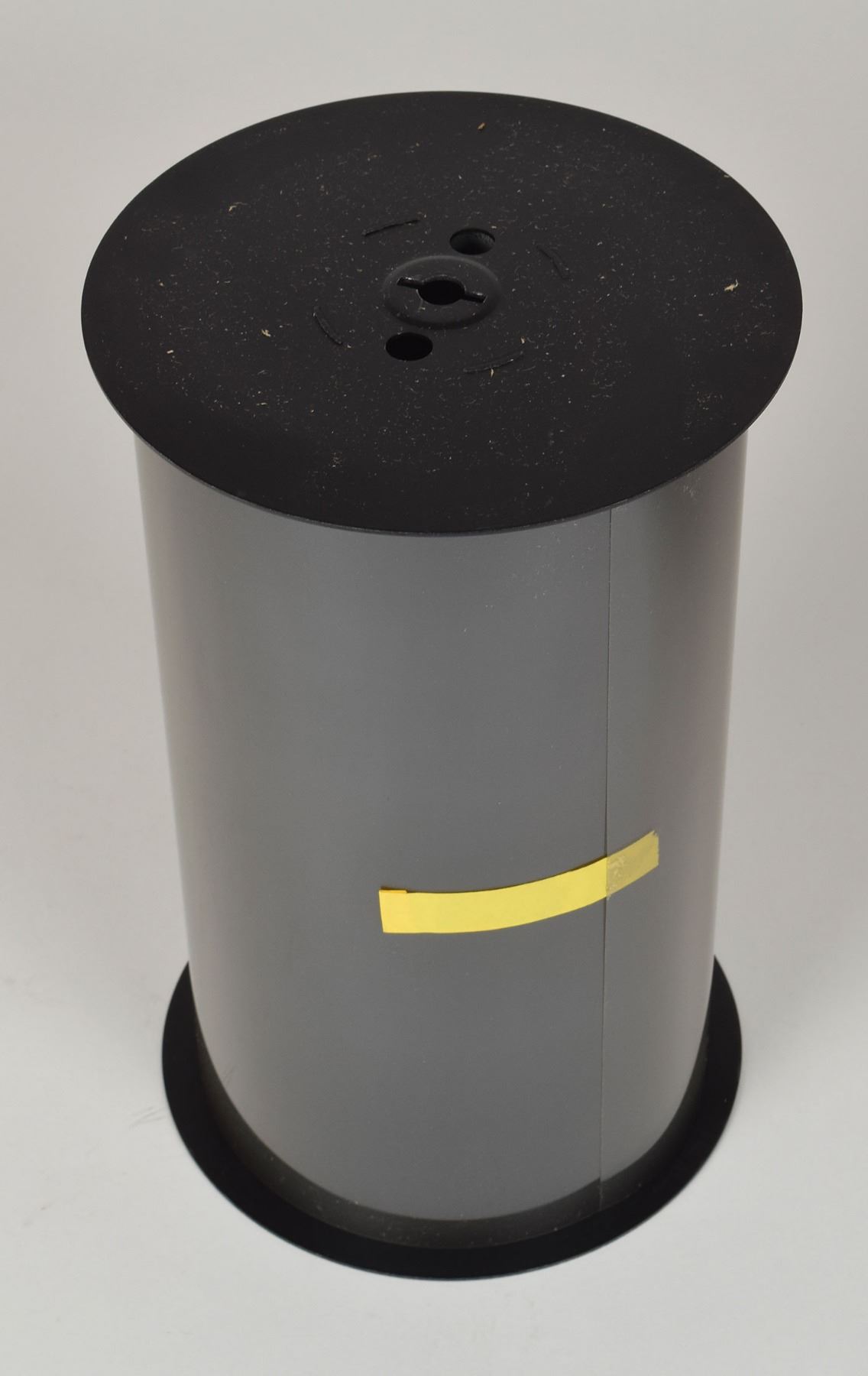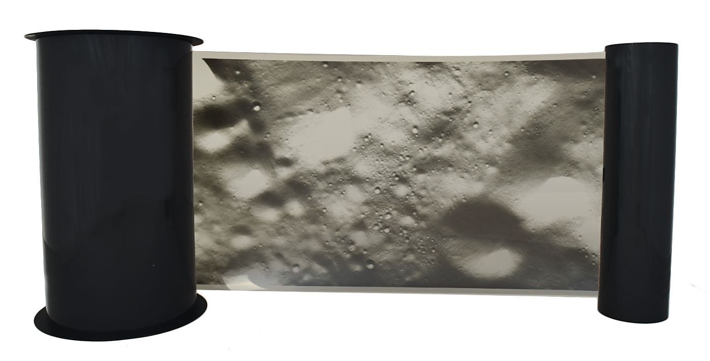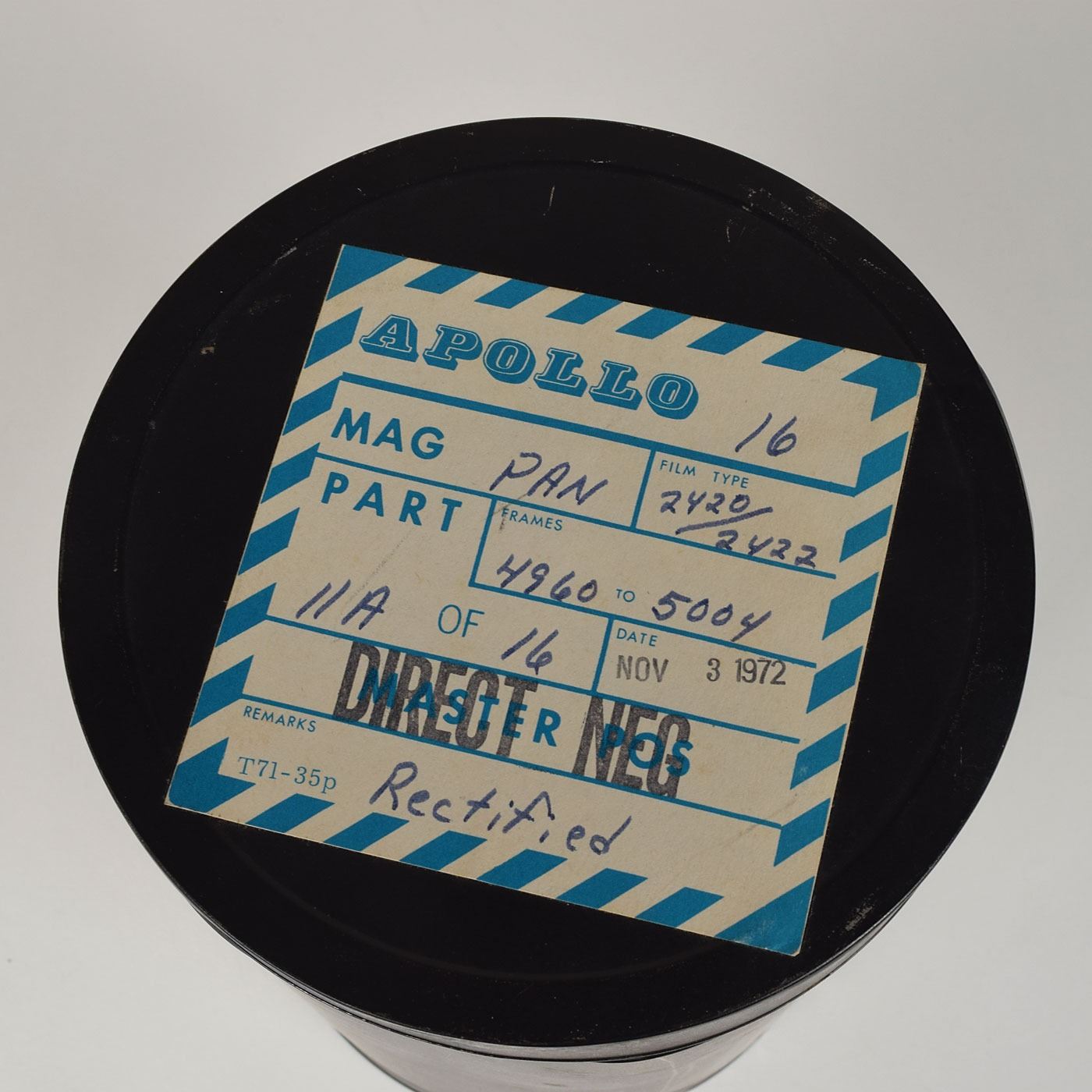 Roll of direct negatives of the lunar landscape taken by the panoramic camera in the Scientific Instrument Module (SIM) Bay of the Apollo 16 CSM, in its original canister measuring 10? tall and 6.25? in diameter. The label on the top reads: “Apollo 16, Mag, Film type: 2420/2422, Part 11A of 16, Frames 4960 to 5004, Date Nov 3 1972, Master, Direct Neg, Rectified.” The roll features 44 panoramic frames of film, each measuring approximately four feet long by nine inches wide. In fine condition. This film was directly reproduced from the original negatives taken in space by the 24-inch-focal-length optical bar panoramic camera produced by Itek, carried in the CSM SIM Bay, which were retrieved by Ken Mattingly during an EVA prior to reentry. These high-resolution lunar panoramas were used in improving NASA’s lunar maps.