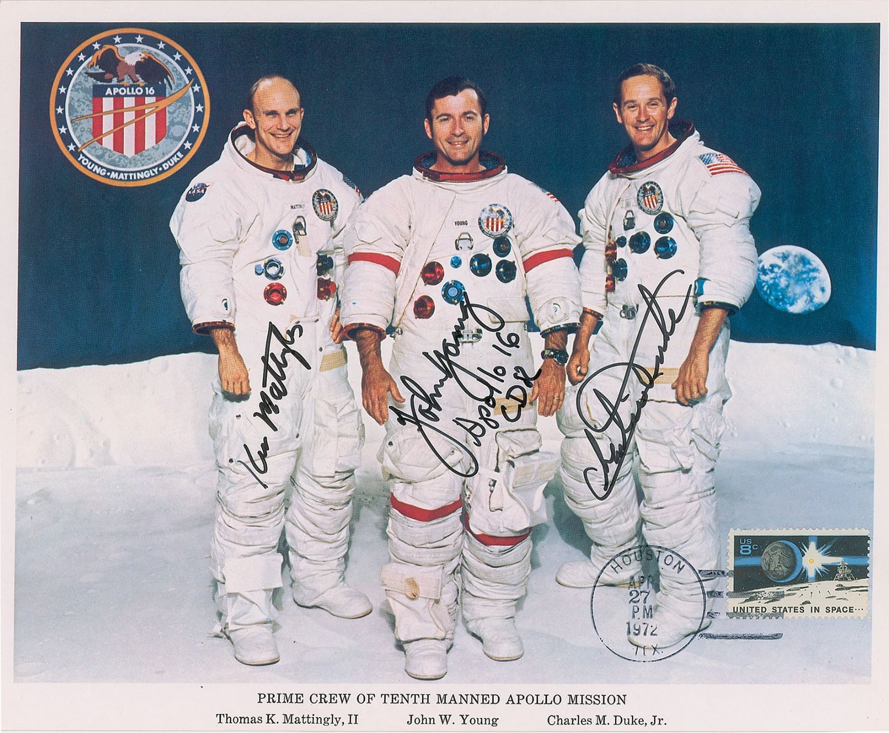 Fantastic official color 10 x 8 NASA lithograph of the Apollo 16 prime crew posing together in their white space suits, signed in black felt tip, "Ken Mattingly," "John Young, Apollo 16 CDR," and "Charlie Duke." Lower right corner bears an affixed 8-cent stamp postmarked at Houston on the mission's return date, April 27, 1972. In fine condition.