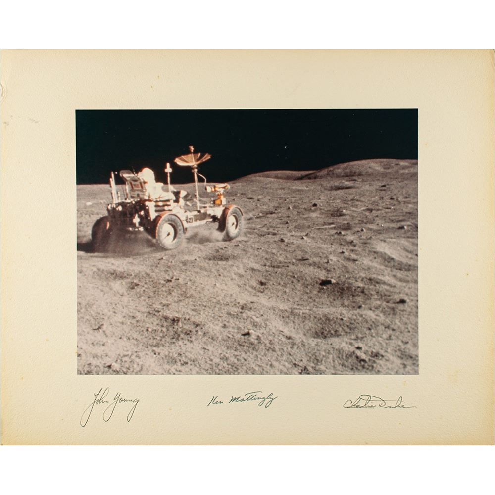 Terrific official color semi-glossy 13.75 x 10.75 NASA photo of Apollo 16 Commander John Young driving the lunar rover during the 'Grand Prix' run at the Descartes landing site, affixed to the original 20 x 16 mount, which is signed in black ink by John Young, Ken Mattingly, and Charlie Duke. In fine condition, with a couple of bumps to the edges of the mount.