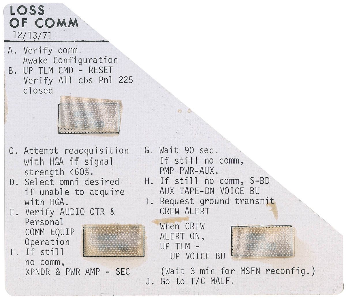 Apollo 16 double-sided triangular-shaped training cue card, 6 x 5.25, with three swatches of Velcro affixed to one side, and one swatch affixed to the other, dated December 13, 1971. Cue card is for “Loss of Comm,” procedures on one side, and “AC PWR,” on the other side. In fine condition, with some scattered light surface loss and staining to one side.