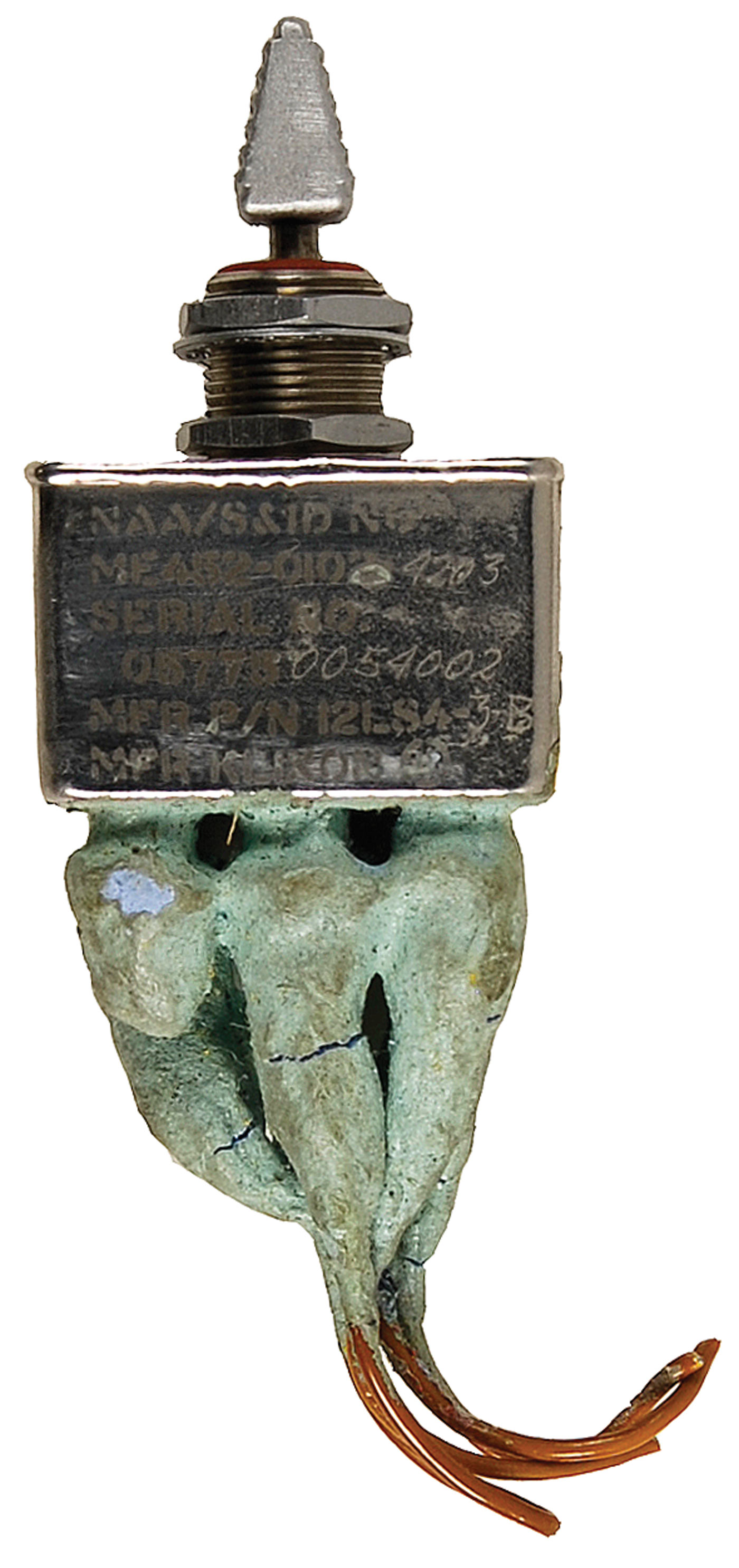 Electrical toggle switch used onboard the Apollo 16 command module Casper during the 1972 mission. The item measures approximately 4 x 1.25 x 1 with a single switch in the front and four exposed wires in the back. Accompanied by a North American Rockwell Corporation Space Division “Temporary Parts Removal Tag” identifying this as “Switch #18” and is serial-numbered “05775-0054002” (with the same number identifiable on a side panel of the switch. A white adhesive sticker affixed to the removal tag is date-stamped September 10, 1973. A rare piece of equipment from Apollo’s fifth lunar landing.