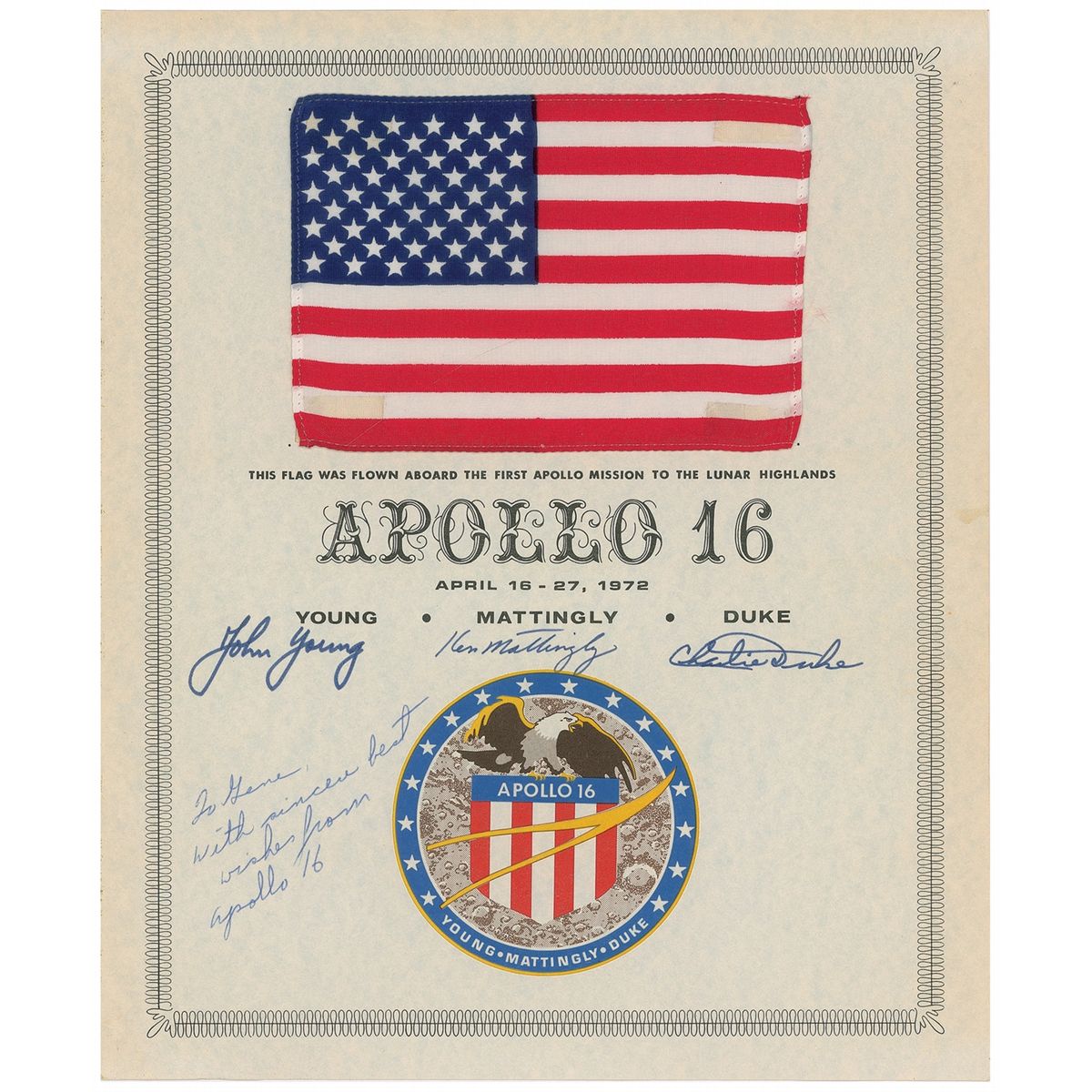 Flown printed fabric American flag, 6 x 4, flown aboard Apollo 16 during its flight to the moon. Flag is affixed by its corners to a 10 x 12 certificate stating “This flag was flown aboard the first Apollo mission to the lunar highlands,” and signed in blue felt tip by crew members John Young, Ken Mattingly, and Charlie Duke. An ink inscription in Duke’s hand reads, ”To Gene, With sincere best wishes from Apollo 16.” Small squares of toning to each corner of flag from adhesive on reverse, and a bit of light toning to borders of certificate, otherwise fine condition.
