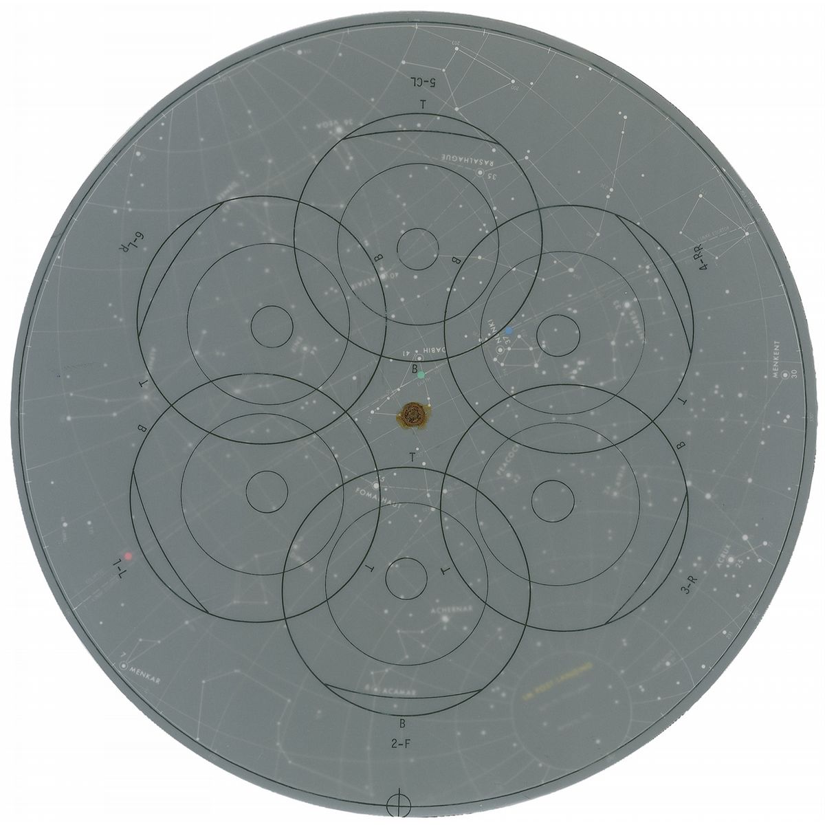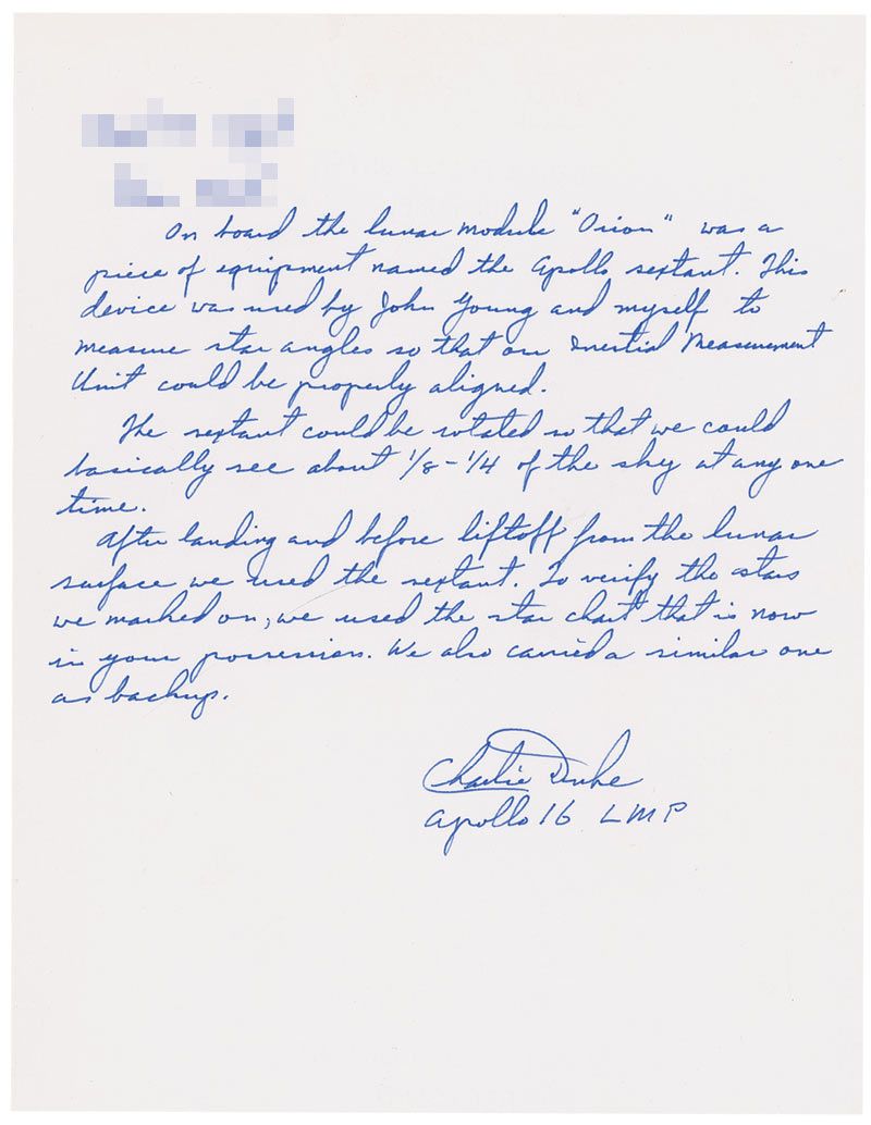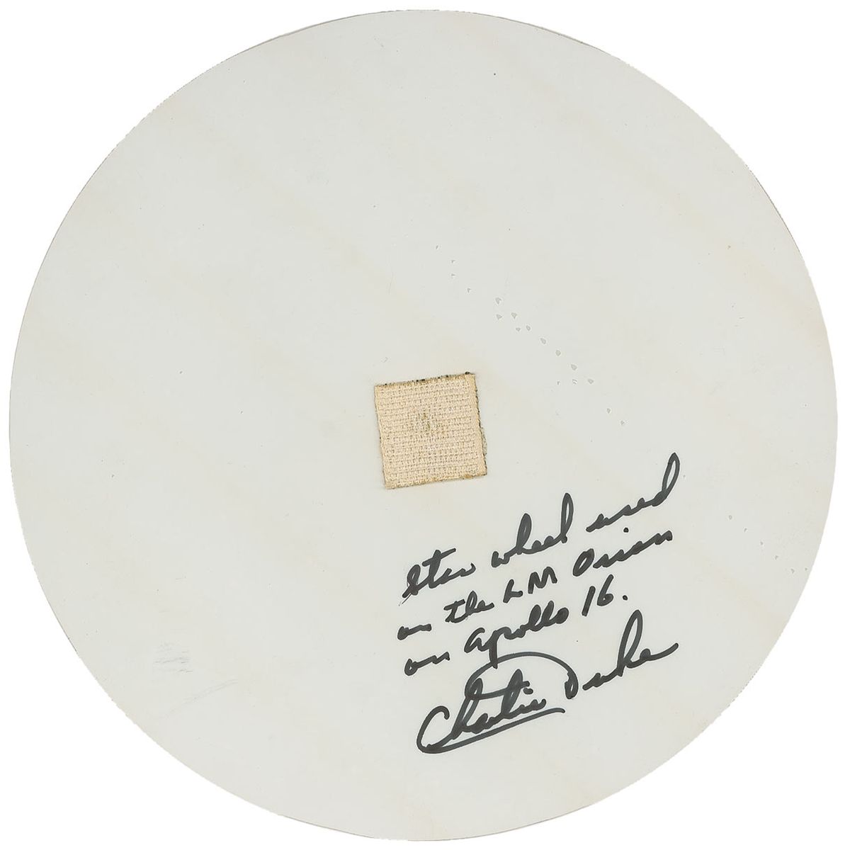 Flown lunar surface star chart carried aboard the lunar module Orion to the Descarte Highlands of the moon. Chart measures 8.25? in diameter with bottom labeled “LM Post-Landing, April 16, 1972 Launch.” All major stars and constellations visible from the landing site are plotted underneath a rotating translucent position locator. The locator has six concentric circular plots, sixty degrees apart, that correspond to position locators set for the Alignment Optical Telescope inside the Lunar Module. Reverse bears a small square of Velcro and is signed in black felt tip, “Star wheel used on the LM Orion on Apollo 16. Charlie Duke.” Accompanied by a letter of provenance from Duke, which reads, in part: “On board the lunar module ‘Orion’ was a piece of equipment named the Apollo sextant. This device was used by John Young and myself to measure star angles so that our Inertial Measurement Unit could be properly aligned…After landing and before liftoff from the lunar surface we used the sextant. To verify the stars we marked on, we used the star chart.” In fine condition. A rare and critical lunar surface navigational tool that reminds all of the kinship that astronauts and the early explorers of Earth–the need to navigate by the stars, whether traveling by sea or through space.