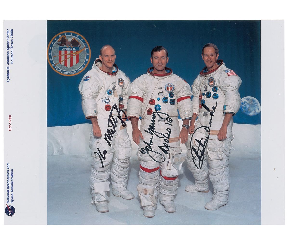 Color glossy 11 x 8 second-generation ‘red-numbered’ NASA photo of the the crew in their space suits posing on a lunar landscape, signed vertically in black felt tip by Ken Mattingly, John Young, and Charlie Duke. In fine condition, with a few trivial surface marks and a small spot of soiling.