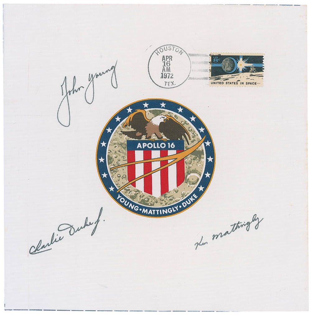 A 9 x 9 swatch of Beta cloth bearing a printed 3.5-inch diameter Apollo 16 mission insignia, and bearing autopen signatures of John Young, Charlie Duke, and Ken Mattingly. Swatch also bears an April 26, 1972, Houston, Texas postmark and an 8-cent postage stamp. In fine condition.