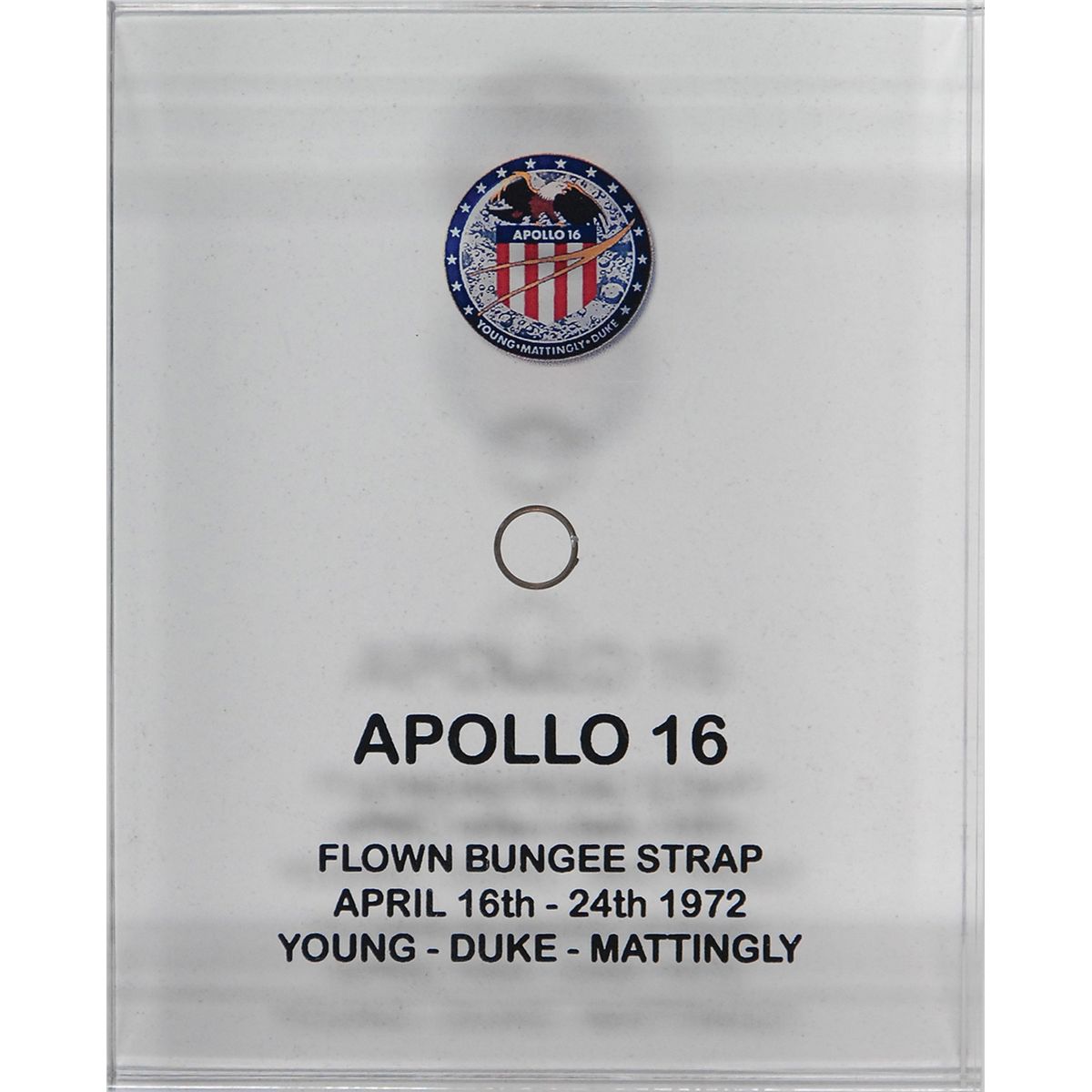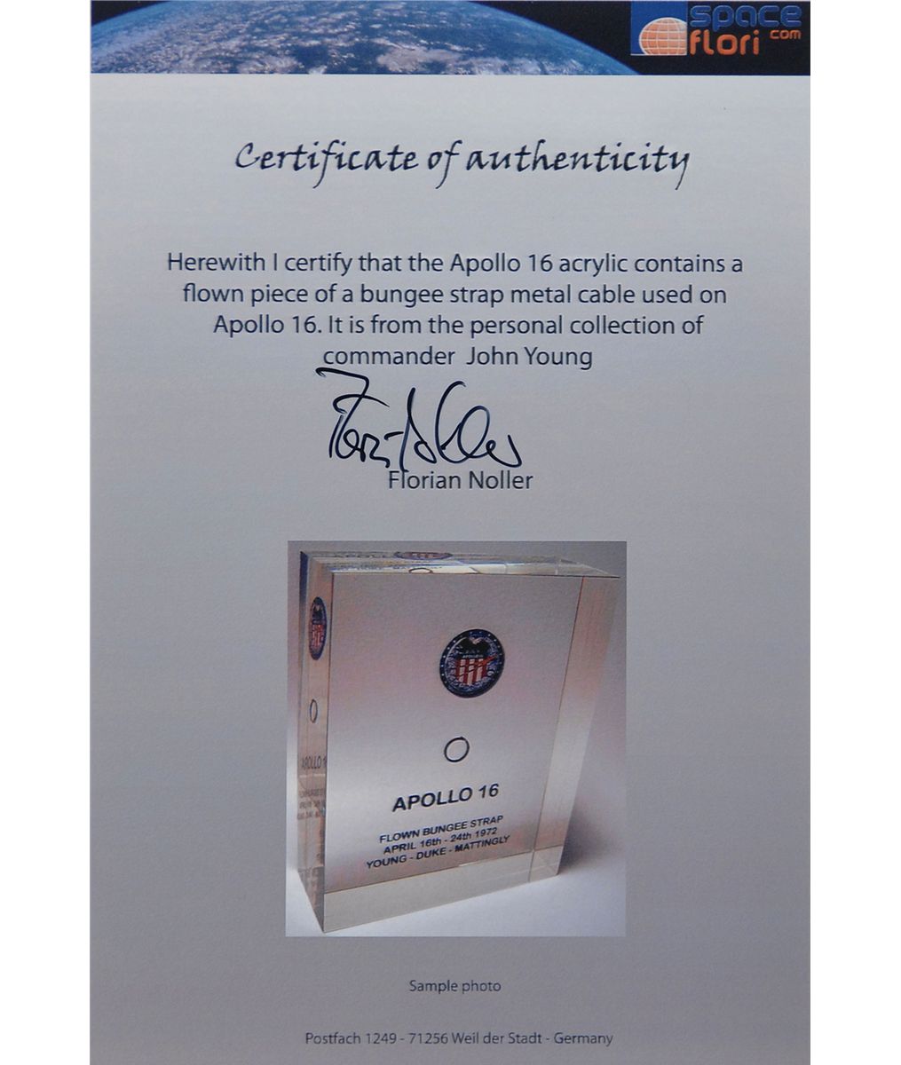 Flown bungee trap metal cable section carried to the moon on Apollo 16. Single loop of strap measures approximately .25? in diameter, and is encased in a 3.25 x 4 x 1.5 acrylic display. Accompanied by a certificate of authenticity from Florian Noller stating the cable came from the personal collection of mission commander John Young.