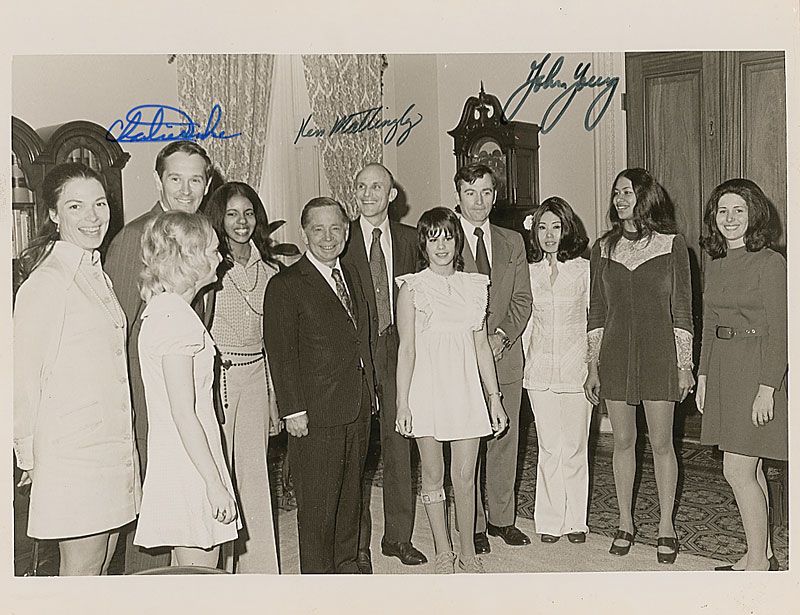 Glossy 10 x 8 photo of the Apollo 16 crew and their families posing with Speaker of the House Carl Albert, signed in black felt tip by Ken Mattingly and John Young, and in blue felt tip by Charlie Duke. In fine condition.