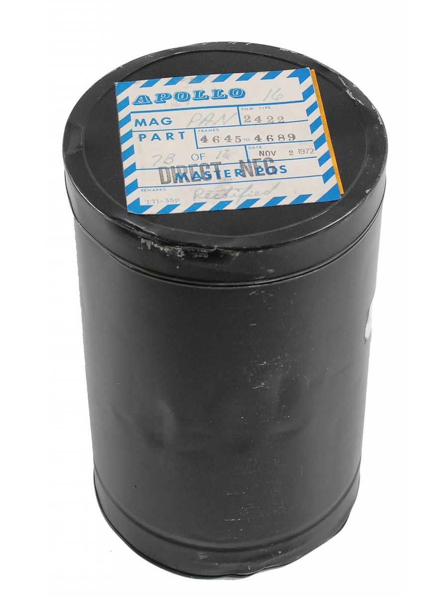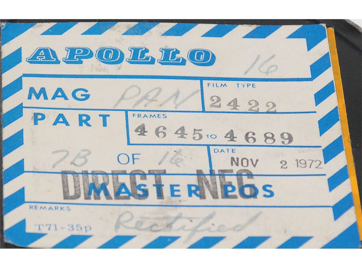 A large roll of negative film of the lunar surface as seen from the Command Module, originally taken by the panoramic camera located in the Scientific Instrument Module (SIM) bay of the Apollo 16 Command Module. This master negative measures 9? wide and an unknown length. The negative is on a metal reel and housed in its original 10? metal canister with its Apollo label on the cover, labeled “Apollo 16,” stating this holds frames 4645 to 4689, stamp-dated November 2, 1972, with “Master Pos,” and also stamped “Direct Neg.” In fine condition. The panoramic camera photographed long sections of the surface, 205 x 13 miles, on 4 foot x 4.5 inch strips of film. The film take-up cassette was removed from the panoramic camera by the Command Module Pilot during trans-Earth trajectory, and was returned to Earth in the Command Module.