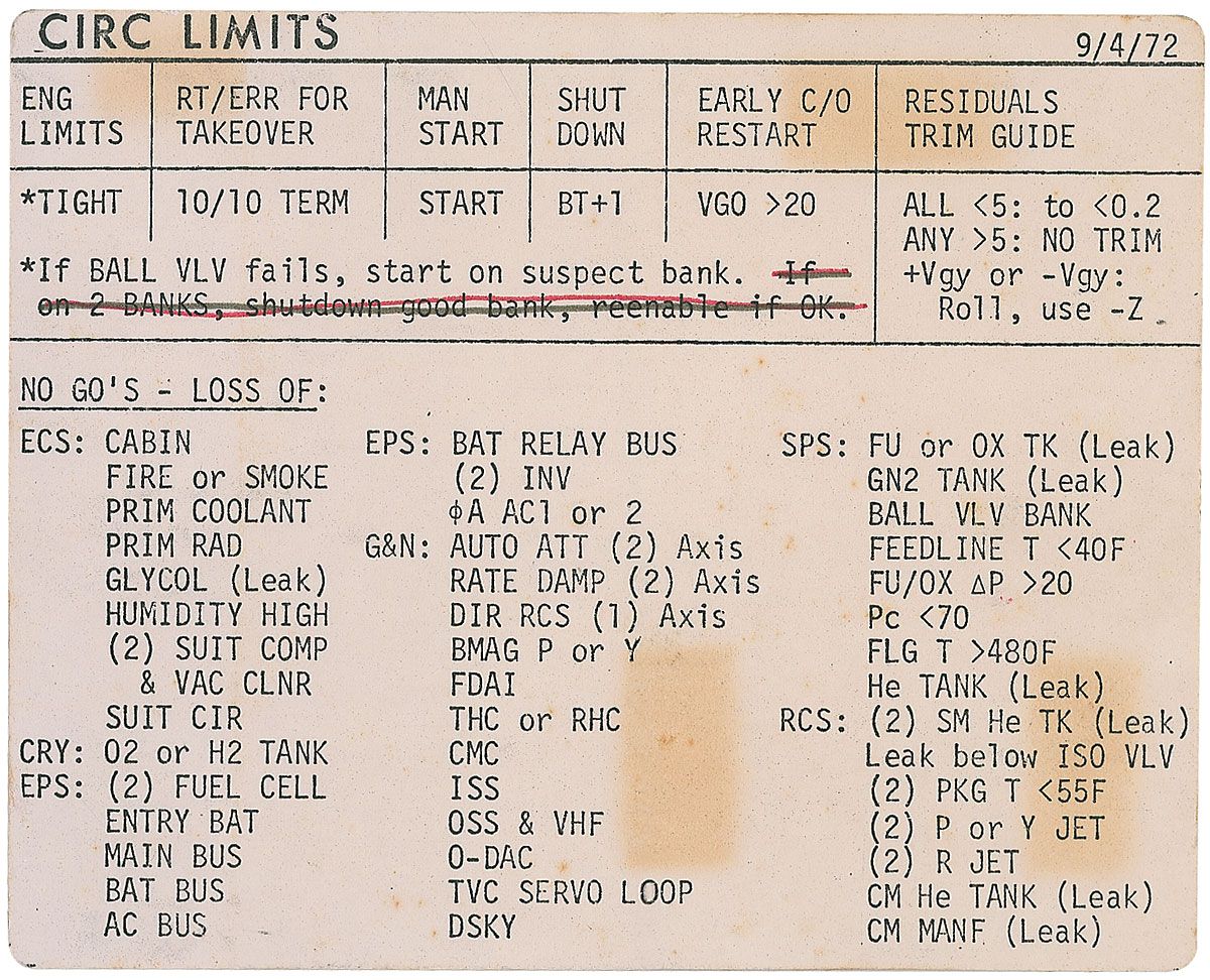 Cue card used during training for the Apollo 16 mission. Card measures 5.75 x 4.75, is dated September 4, 1972, at the top, and is headed at the top, “CIRC Limits,” followed by several commands, with the lower portion listing three columns of “no go’s,” which would prevent the astronauts from continuing their mission. Among the potential problems are fire or smoke in the cabin, issues with the oxygen and hydrogen cryo tanks, and guidance and navigation problems. Card has two crossed out lines done by one of the trainees. Reverse has three small swatches of Velcro affixed and is labeled in the upper right, “CMS28.” In fine condition, with expected light wear and light blocks of toning.