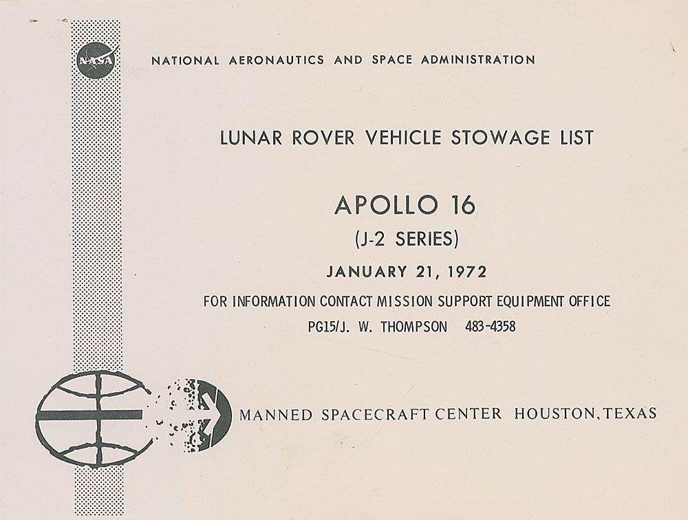 Original Apollo 16 Lunar Rover Vehicle Stowage list, 11 x 8.5, unbound, 13 pages, issued by NASA on January 21, 1972. In fine condition.