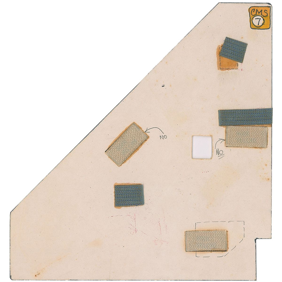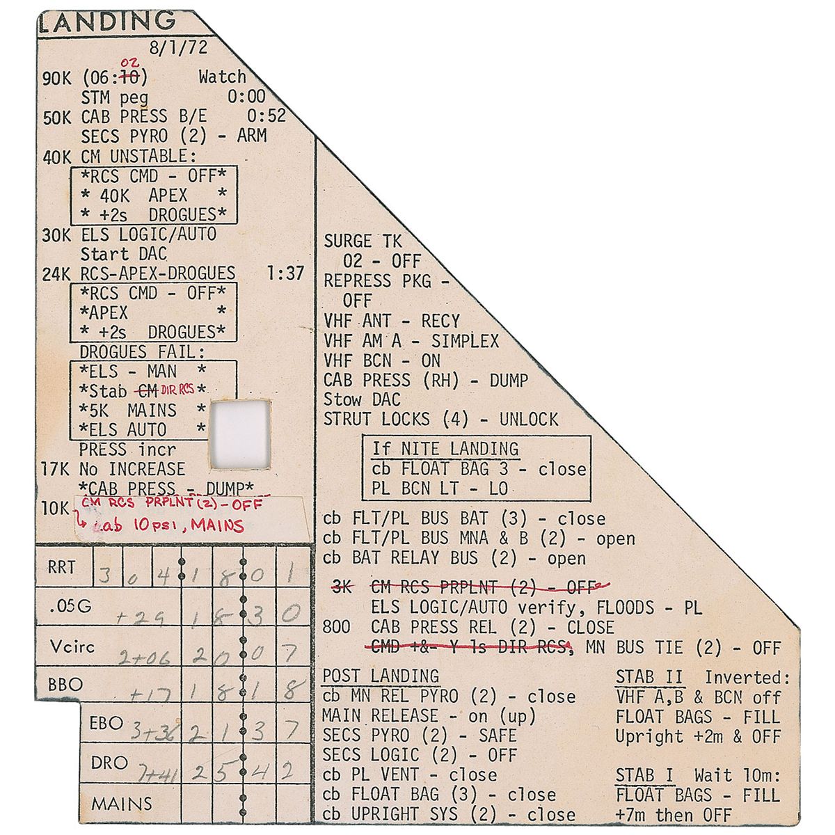 Triangular-shaped cue card used during training for the Apollo 16 mission. Card measures 6.5 x 7, is dated August 1, 1972, at the top, and holds procedures for splashdown as well as several emergency procedures, including “CM Unstable,” and “Drogues Fail.” The table in the lower left corner has been filled out in pencil by one of the trainees, with several red ink notations and crossed out lines on the card as well. Card starts with the capsule at 90K, has a small box with additional instructions for a night landing, and finishes with a post-landing checklist and capsule stabilization with float bags. Reverse has several small swatches of Velcro affixed and is labeled in the upper right, “CMS7.” In fine condition, with expected light wear.