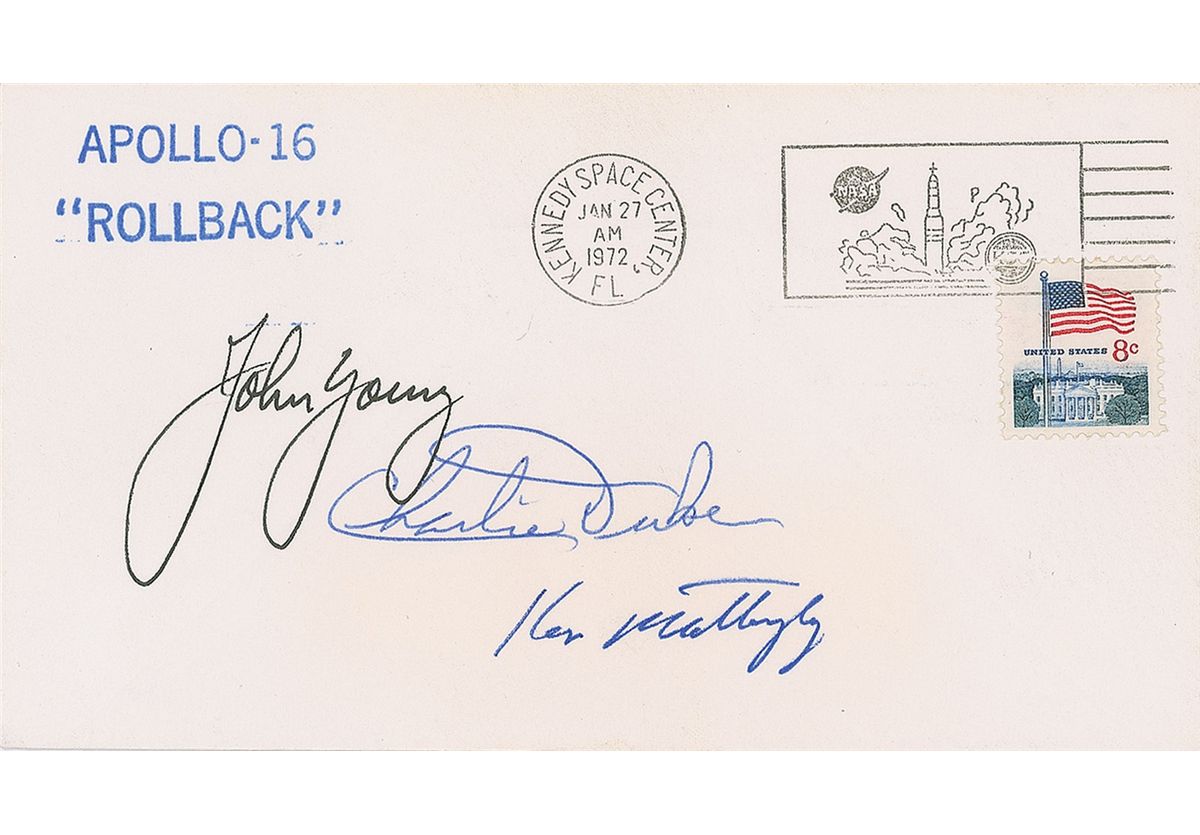 Commemorative cover with a stamped cachet reading “Apollo-16, ‘Rollback,’” signed in felt tip and ballpoint by John Young, Charlie Duke, and Ken Mattingly. In fine condition.