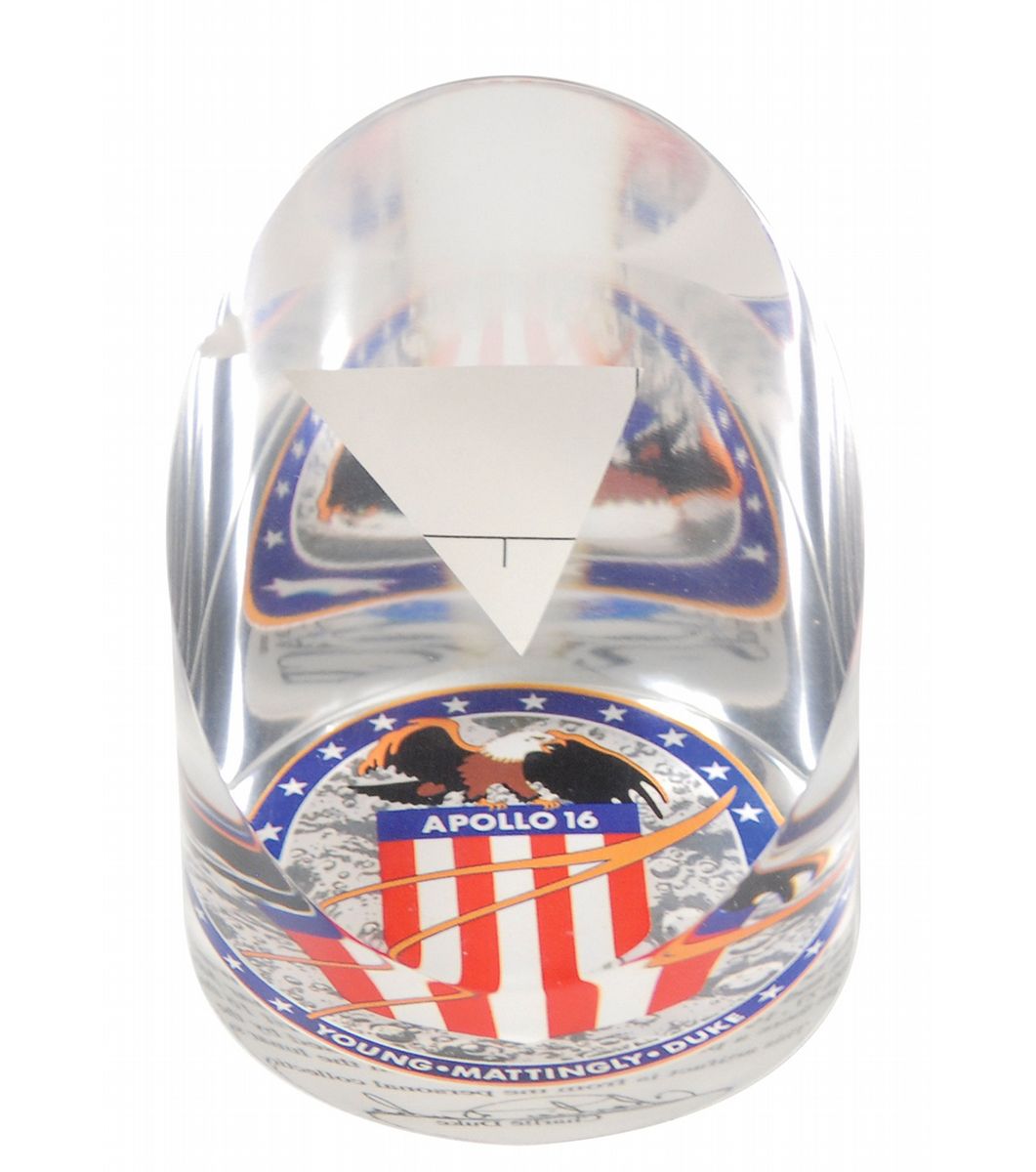 Flown Pyro System schematic section from a data book flown to the moon’s surface aboard the Apollo 16 Lunar Module Orion, approximately 1.5 x 1.5. Encased in a cylindrical 2.75 x 3.25 piece of Lucite cut at an angle for display purposes, with an Apollo 16 emblem and certificate of authenticity at the bottom. Originally distributed through the Astronaut Scholarship Foundation. In fine condition. Accompanied by a matching certificate of authenticity signed by astronaut Charlie Duke certifying that it is a piece from his personal collection.