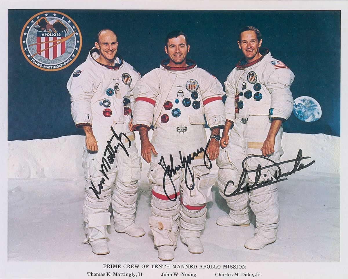 Official color 10 x 8 NASA lithograph of the Apollo 16 prime crew in their white spacesuits, signed in black felt tip by John Young, Ken Mattingly, and Charlie Duke. In fine condition. Consignor notes that the Mattingly and Duke signatures were obtained in person. Accompanied by a certificate of authenticity from Novaspace for the Young signature. A superior example of one of the harder-to-find fully signed crew photos.