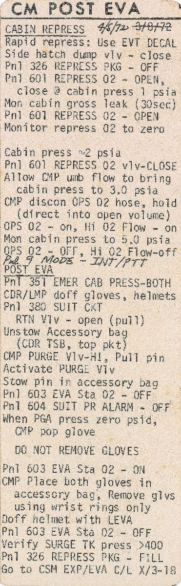 Cue card used during Apollo 16 simulation bay training, 2.5 x 8, dated April 5, 1972, headed “CM Post EVA,” and listing steps for “Cabin Repress” and “Post EVA” following extravehicular activity, with an ink notation, “Pnl 9 Mode—INT/PTT” and date correction. Reverse side, dated March 8, 1972, bears three small swatches of affixed Velcro, and an ink notation in the upper right corner, “QTRS, 26.” In fine condition.