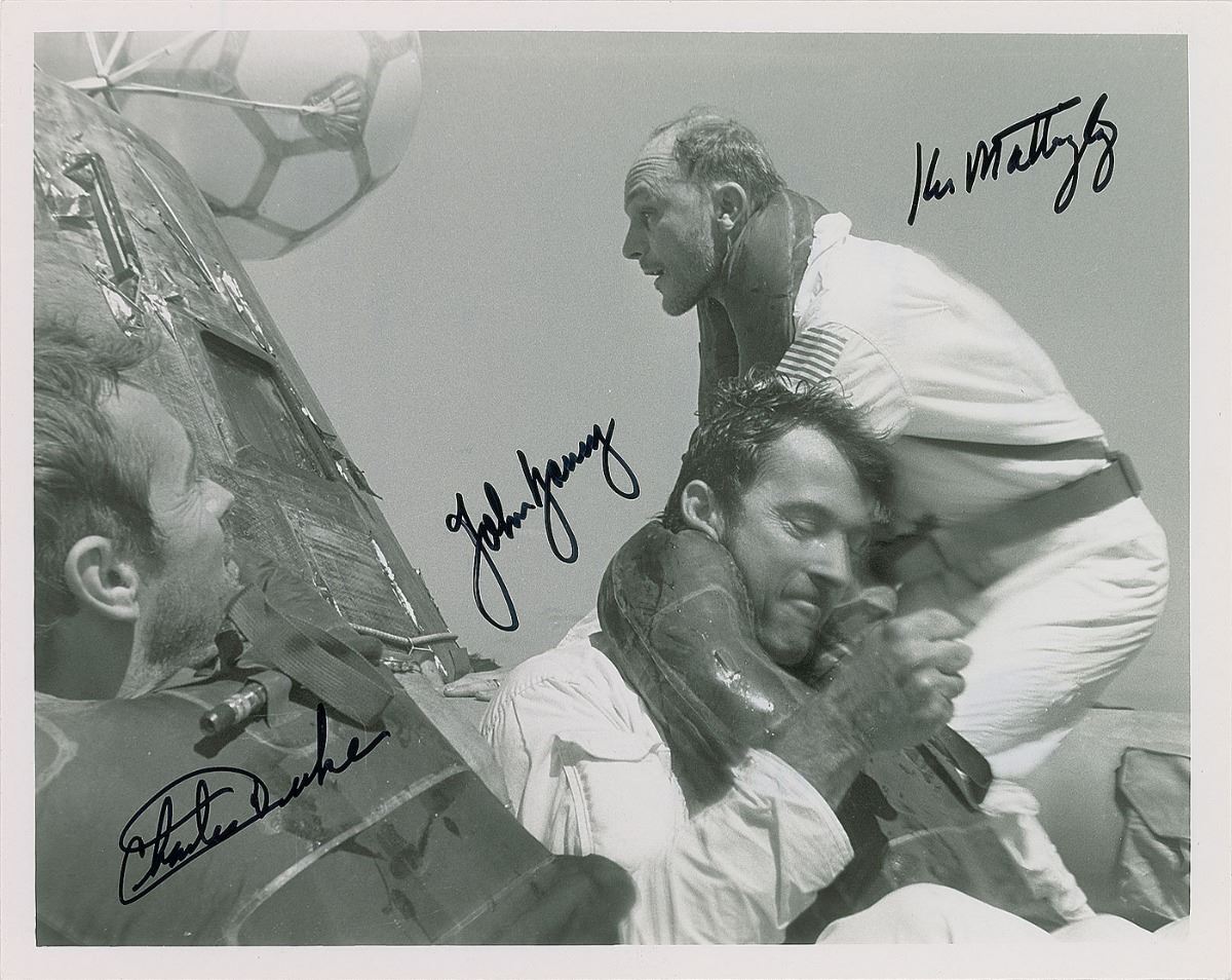 Official glossy 10 x 8 NASA photo of the Apollo 16 crew after splashdown in the Pacific Ocean, signed in black felt tip by John Young, Charlie Duke, and Ken Mattingly. Reverse bears purple NASA caption text. In fine condition, with the very faint impression of a second Duke signature from a different item signed on top of this one (visible only at an angle).
