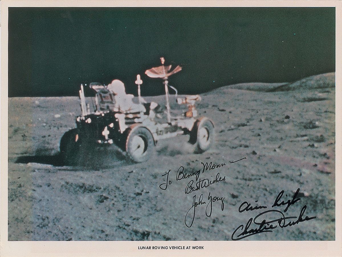 Color semi-glossy 11 x 8.25 double-weight photo of the rover driving on the lunar surface during the Apollo 16 mission, signed and inscribed in black felt tip, “To Benny Monn—Best Wishes, John Young” and “Aim high, Charlie Duke.” In fine condition.