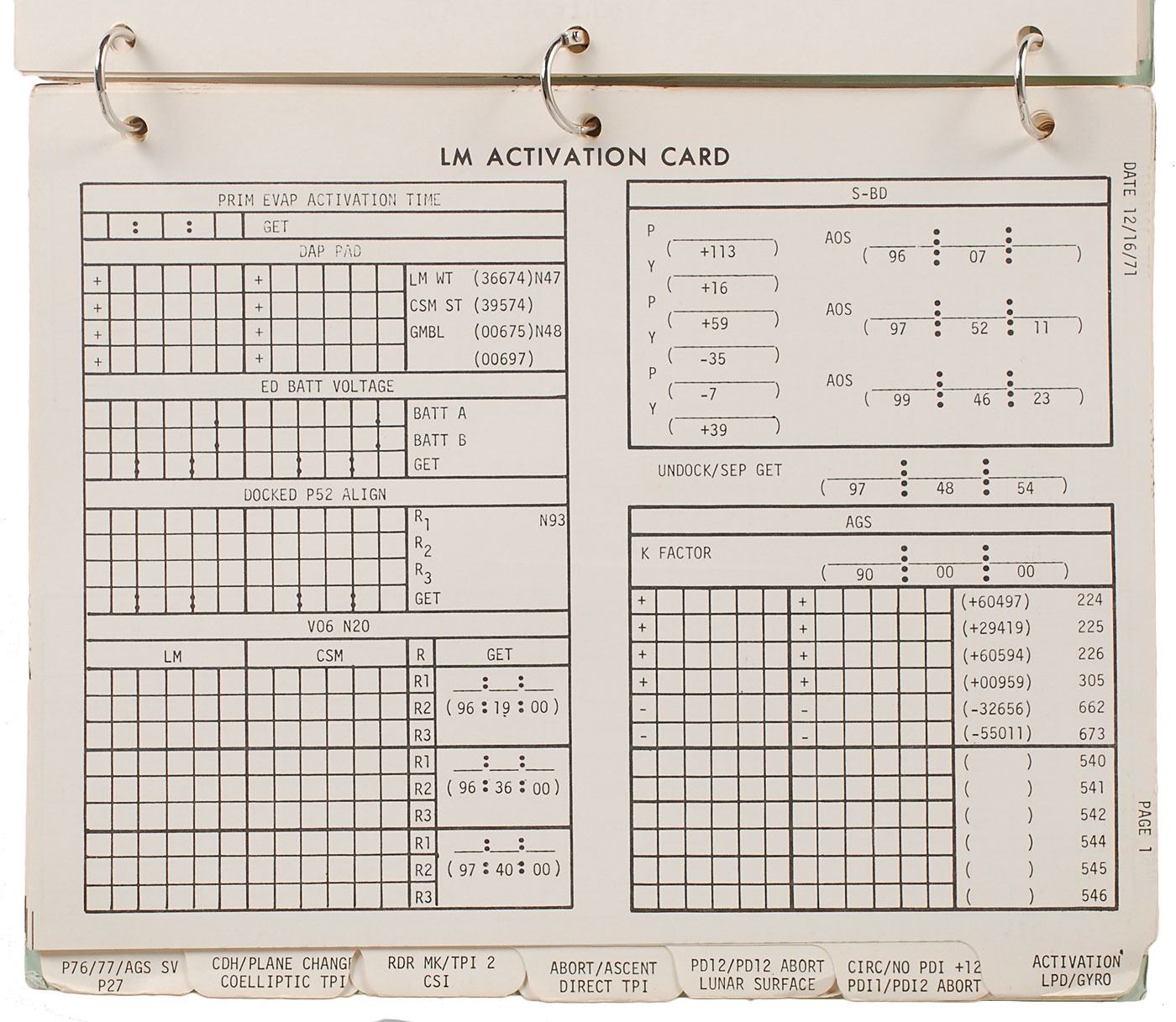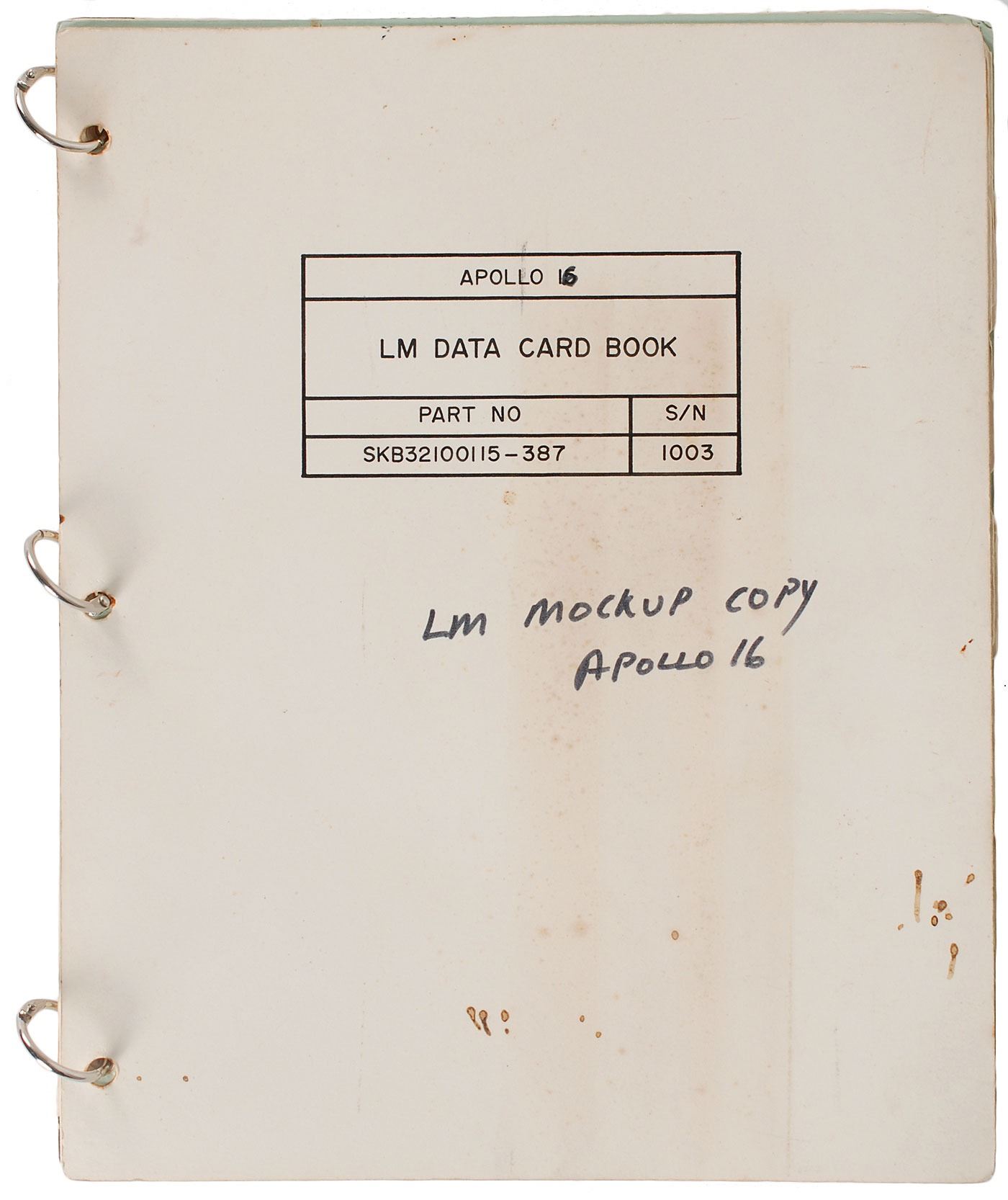 Ring-bound Apollo 16 Basic LM Data Card Book used by Charlie Duke during mission training, 32 pages plus cardstock covers, 8.5 x 10.5, December 16, 1971, signed on the title page in black felt tip, “Charlie Duke, LMP.” The manual consists of numerous sections related to the operation of the lunar module Orion, including: LM Activation, Abort/Ascent, LM Jettison, EVA Mission Rules Summary, Ascent and Descent Stage Curves, and Earth and Planet Unit Vectors. The front cardstock cover bears a felt tip notation, “LM Mockup Copy, Apollo 16.” In fine condition. On the overwhelming success of the Apollo 15 lunar module Falcon, the mission’s original data card book would later serve as the lead training manual for Duke and his Apollo 16 crew, amended at various points to suit any specific mission details.