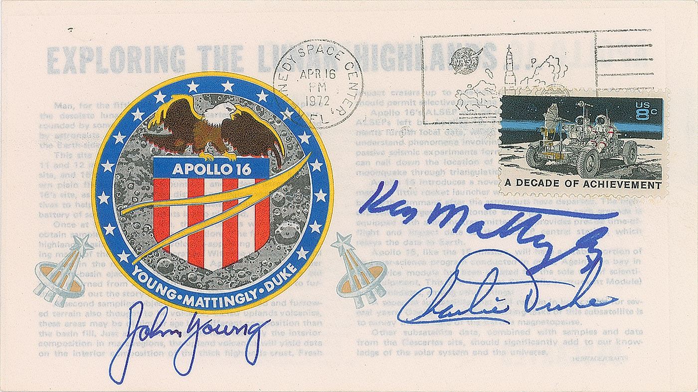 Apollo 16 insurance cover with a cachet of the mission insignia and two sets of astronaut wings, bearing an April 16, 1972, Kennedy Space Center launch date postmark, signed in blue ink and felt tip by John Young, Charlie Duke, and Ken Mattingly. In fine condition.