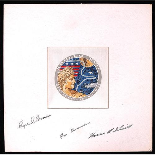 <Our item number 136940><B>Apollo 17, 1972, Crew Patch Beta Cloth.</B> (5x5") The Beta cloth is inset into a Presentation Board (11x11") with autopen crew autographs at the bottom. Striking and desirable. <BR>Estimated Value $250 - 350. <BR><BR>Our item number 136940<BR><IMAGES><P ALIGN="CENTER"><IMG SRC="http://www.goldbergcoins.net/liveauction/49jpegs/136940.jpg"> </P></IMAGES>