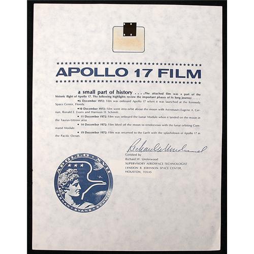 <Our item number 138695><B>Apollo 17, 1972, FLOWN Camera Film.</B> (50x55mm.) This flown, unexposed film is from the leader of a film roll used on the lunar surface by the astronauts. The consignor salvaged it after the flight. Mounted on a blue/white Underwood certificate of authenticity (8x10"), this film was part of the last film on the lunar surface. Minor paperclip bends on the certificate do not detract. Rare. <BR>Estimated Value $500 - 600. <BR><BR>Our item number 138695<BR><IMAGES><P ALIGN="CENTER"><IMG SRC="http://www.goldbergcoins.net/liveauction/49jpegs/138695.jpg"> </P></IMAGES>