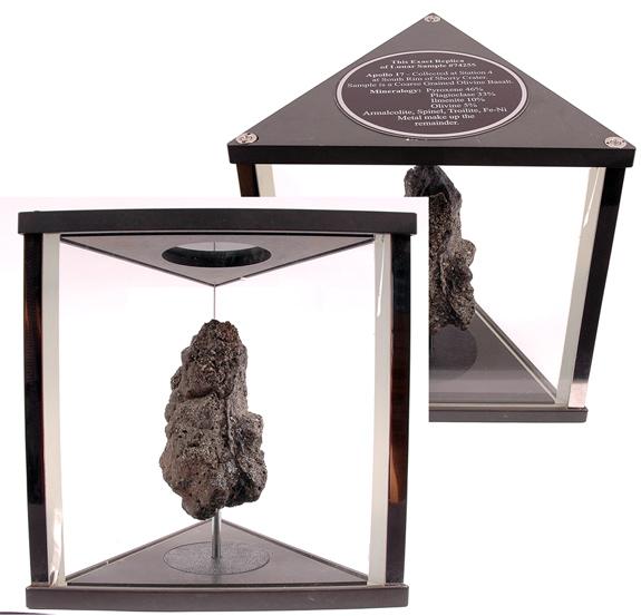 Apollo 17, 1972, "Lunar Rock" Exact Replica (about 4.5x2") This replica is enclosed in a special triangular plate glass (heavy) presentation display (8.5x8.5x8.5x9") with a circular metal label on top that reads: "This Exact Replica of Lunar Sample #74255 / Apollo 17 - Collected at Station 4 at South Rim of Shorty Crater. Sample is a Coarse Grained Olivine Basalt / Mineralogy: Pyroxene 46%, Plagioclase 33%, Ilmenite 10%, Olivine 5%, Armalcolite, Spinel, Troilite, FeNi Metal make up the remainder".