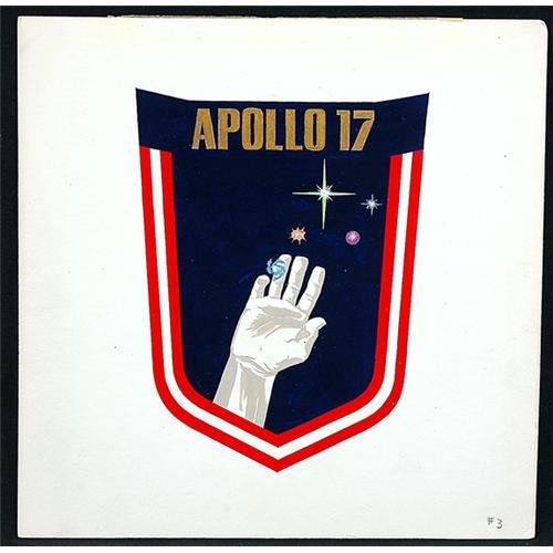 <Our item number 138382><B>Apollo 17, 1972, Unaccepted Al Stevens Crew Patch Painting.</B> (10x10") This mixed media original artwork on posterboard by artist Al Stevens is an unaccepted design concept for the flight's crew patch. Designated "#3" on the front of the posterboard, the various symbols in the design are explained on the reverse of the painting. Stevens did the final design artwork for Apollo 1, 7, 9 and 10 and made design proposals for Apollo 11, 12 and 17. Unique, striking and quite important. <BR>Estimated Value $500 - 750. <BR><BR>Our item number 138382<BR><IMAGES><P ALIGN="CENTER"><IMG SRC="http://www.goldbergcoins.net/liveauction/49jpegs/138382.jpg"> </P></IMAGES>