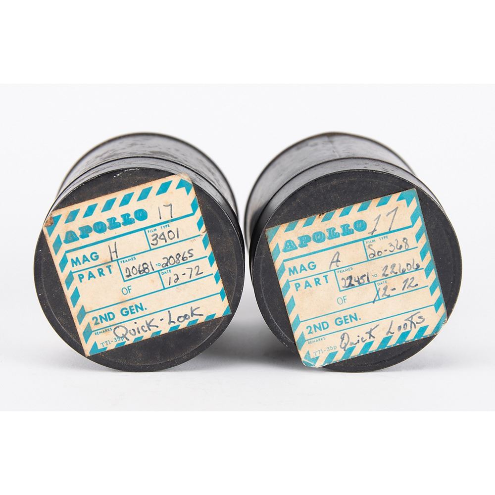 Two scarce rolls of vintage second-generation 70mm color positive transparencies of photographs taken during the Apollo 17 mission, from the collection of Otto Berg. Both film reels are housed in their original canisters with blue labels on the top, reading: "Apollo 17, Mag H…Frames 20681 to 20865, Date 12-72, 2nd Gen., Quick Look" and "Apollo 17, Mag A…Frames 22451 to 22606, Date 12-72, 2nd Gen., Quick Looks." Magazine H features images taken on the lunar surface during the Apollo 17 EVAs, including the traverse of the LRV. Magazine A has a few images of the CSM as seen from the Lunar Module, followed by images of the Apollo 17 EVAs. Both reels are incomplete, with several frames clipped out. In overall very good to fine condition.