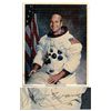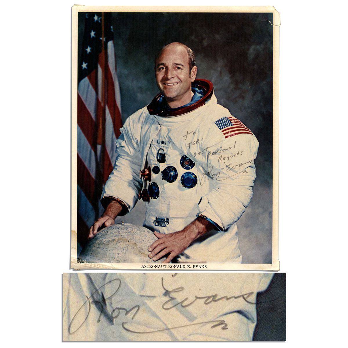 Apollo 17 astronaut Ron Evans signed photo. NASA publicity image is inscribed across his spacesuit, ''To Jeri / Best personal regards / Ron Evans''. Semi-matte photo measures 8'' x 10''. Dampstaining to lower left and a small closed tear to upper right. Very good condition.