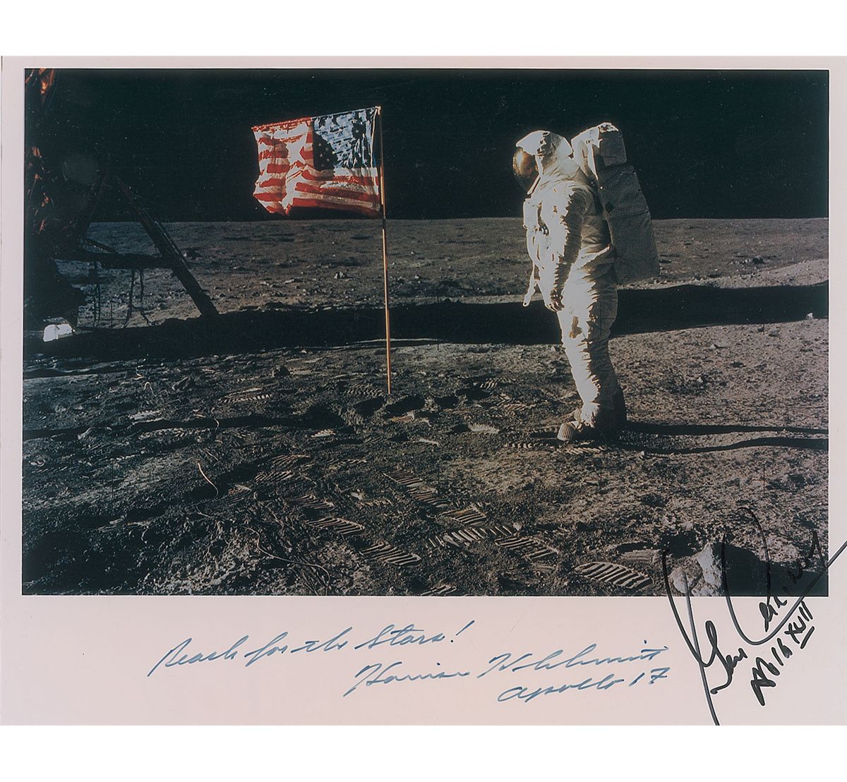 Color satin-finish 10 x 8 photo of Buzz Aldrin on the lunar surface, signed in blue felt tip, “Reach for the stars! Harrison Schmitt Apollo 17,” and in black felt tip, “Gene Cernan, Apollo XVII.” In fine condition.
